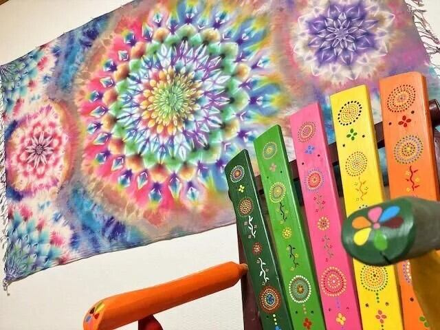 全て染色されるタイダイ染め、絞り染めの作品群。