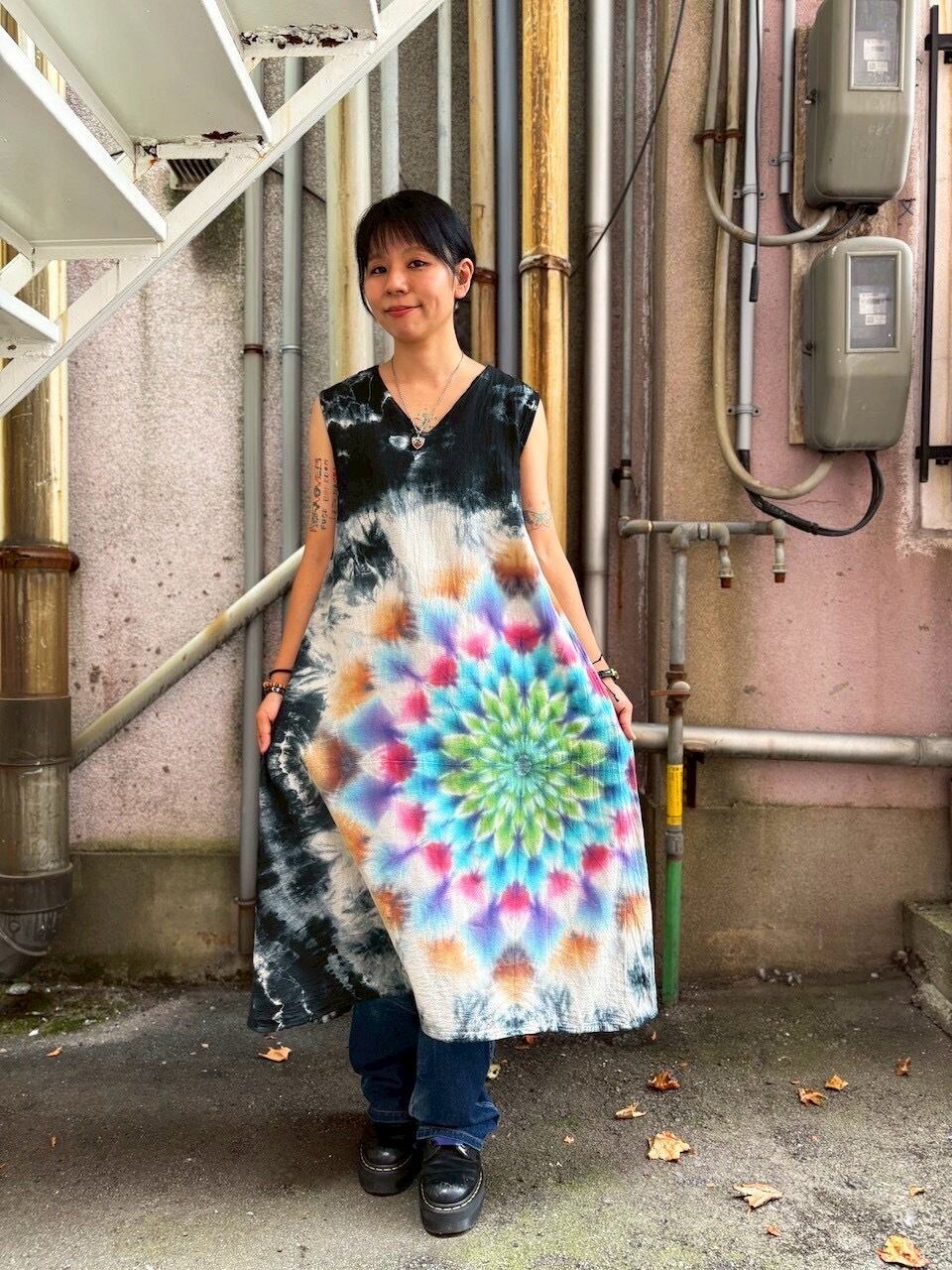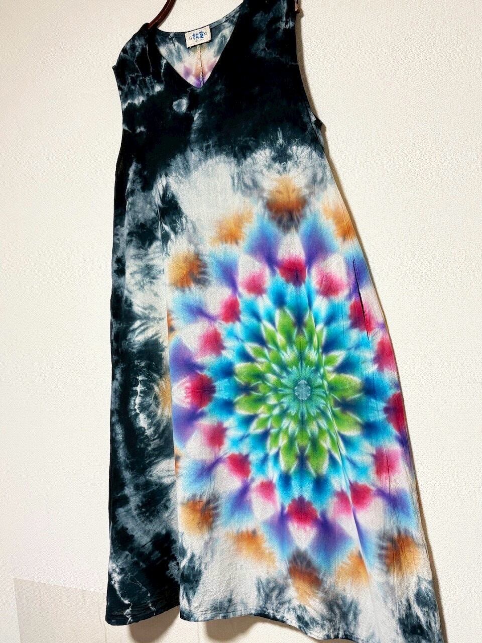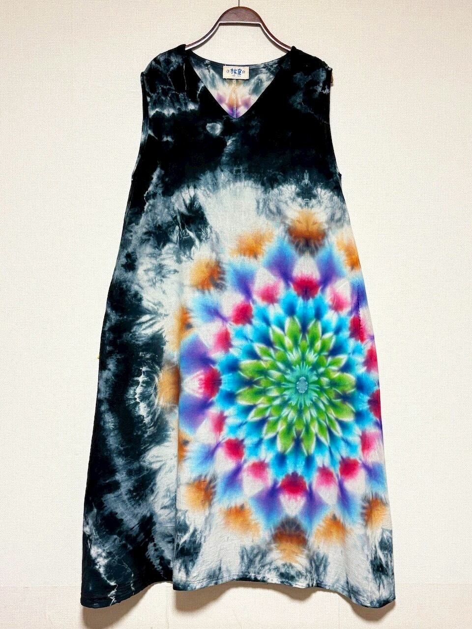タイダイ Tie-dye ノースリーブワンピース 幻想的な大曼荼羅 ブラック ムラ染め HD24-72