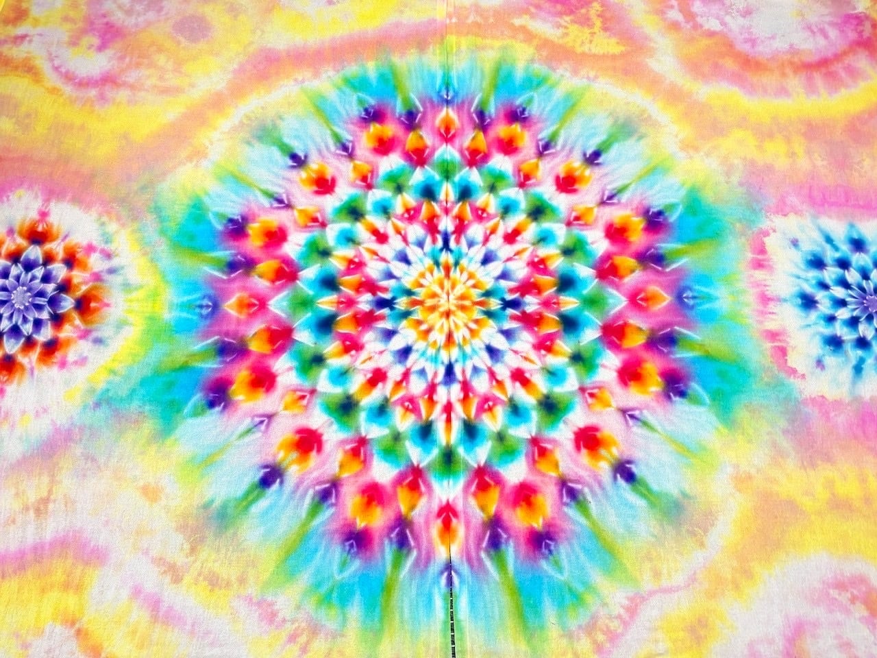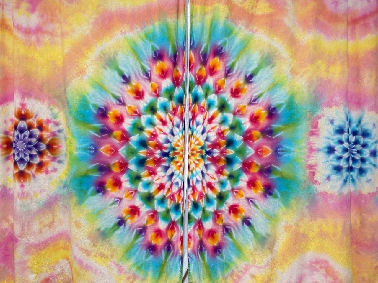 全て染色されるタイダイ染め、絞り染めの作品群。