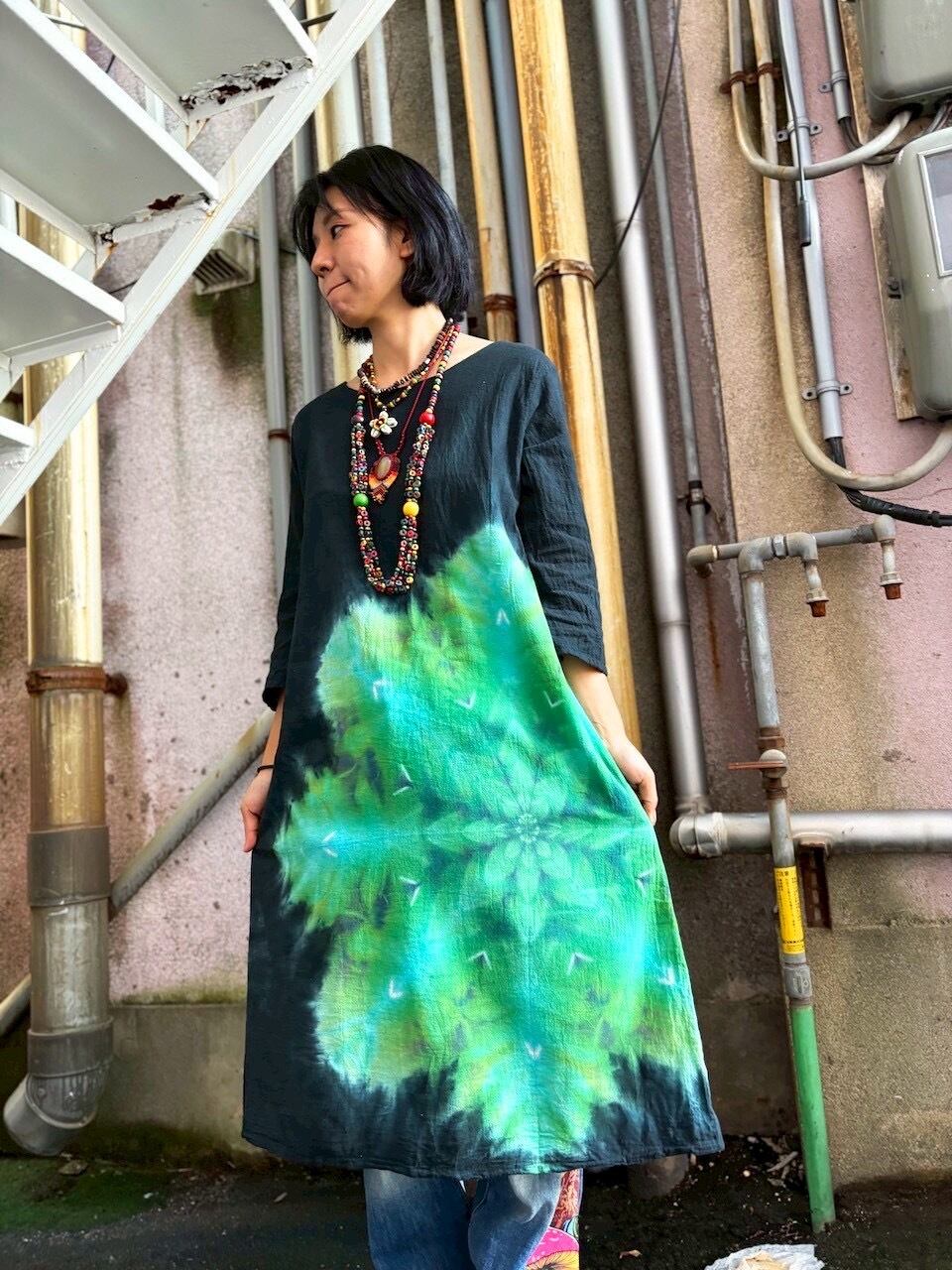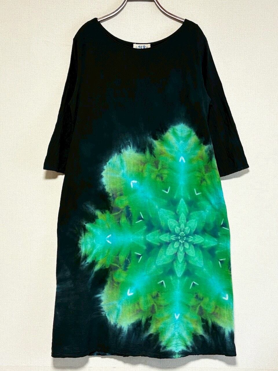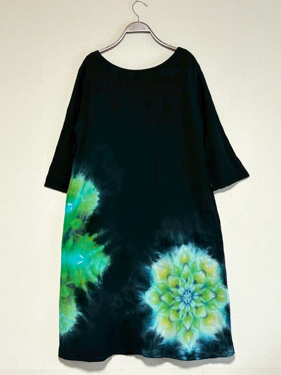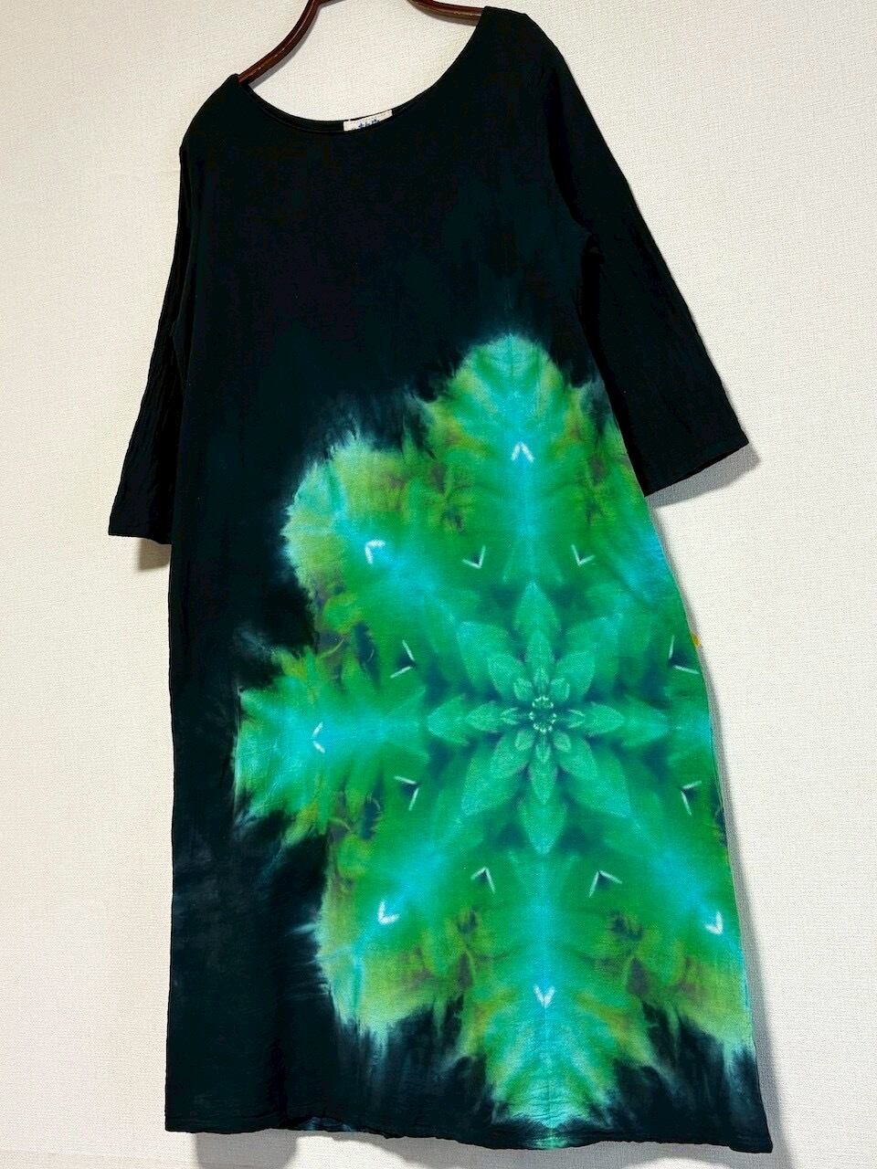 タイダイ Tie-dye 長袖ワンピース 黒 ブラックビューティ 碧翠色の幻想的なスノーフレイク HD25-15