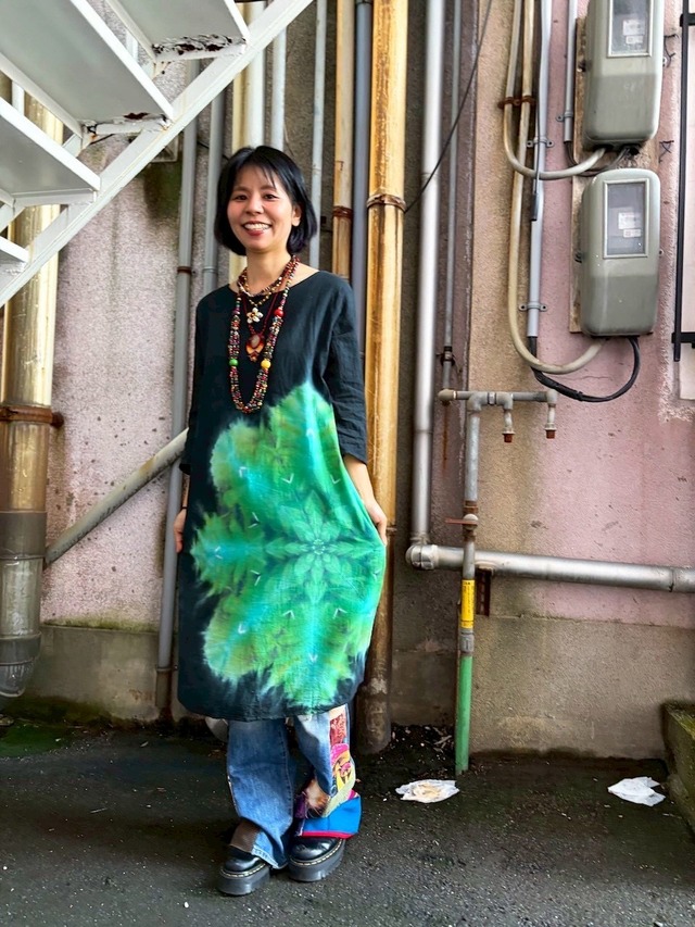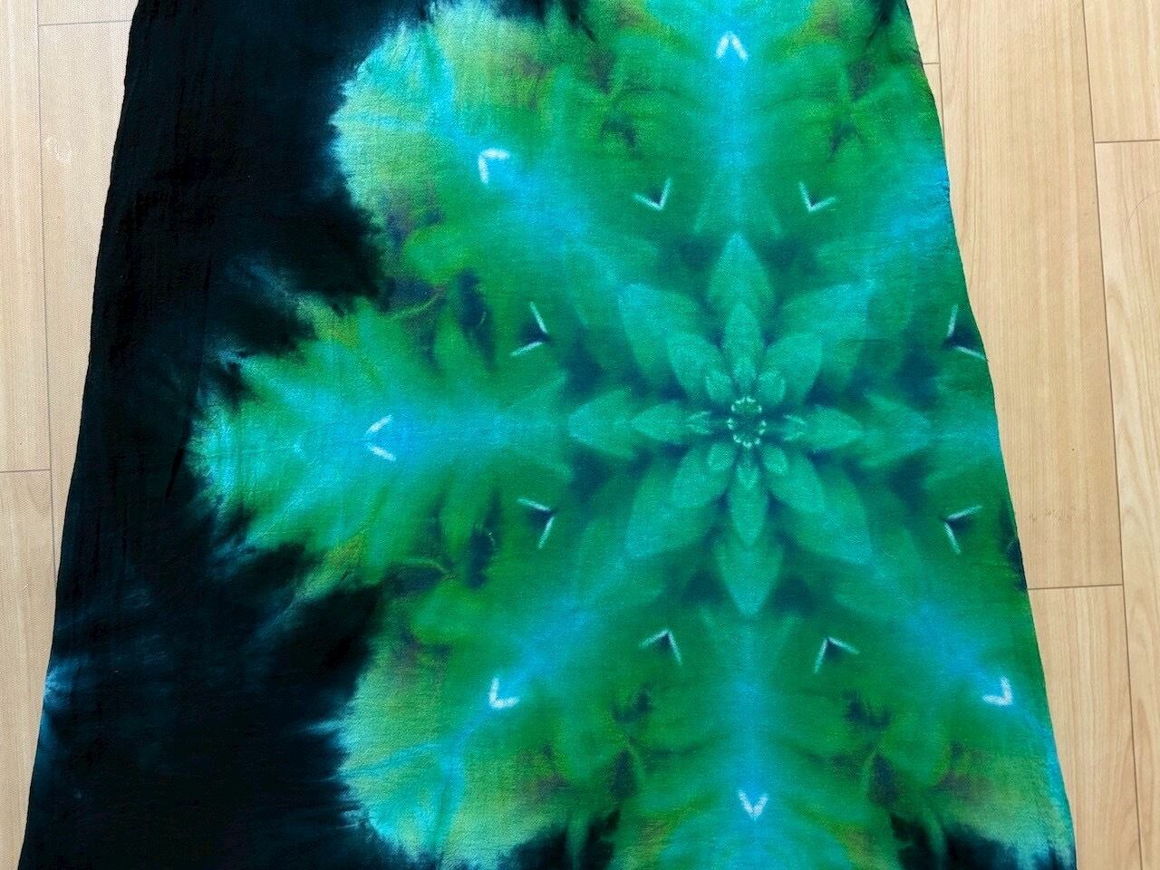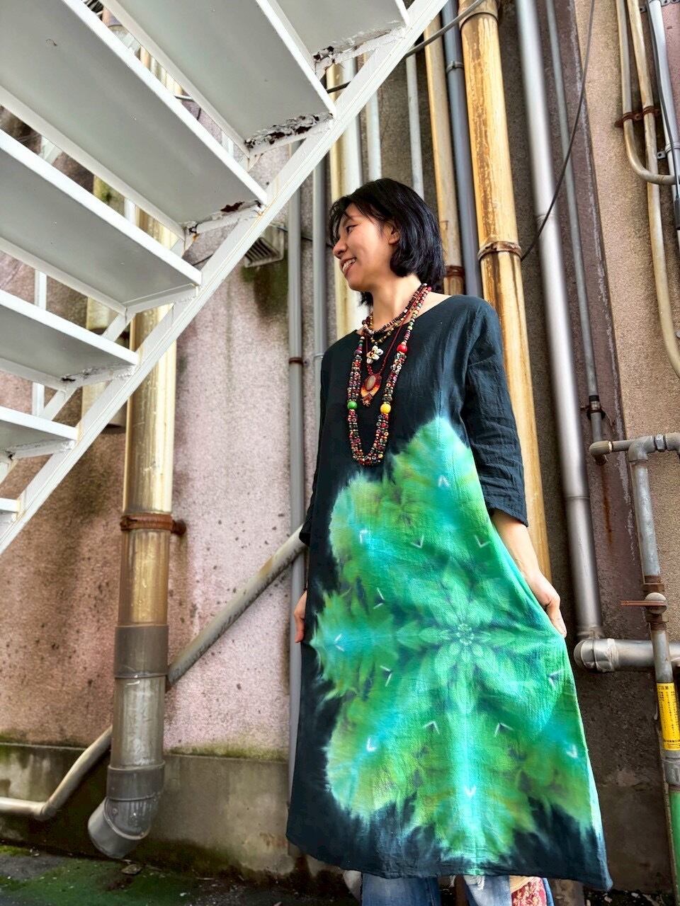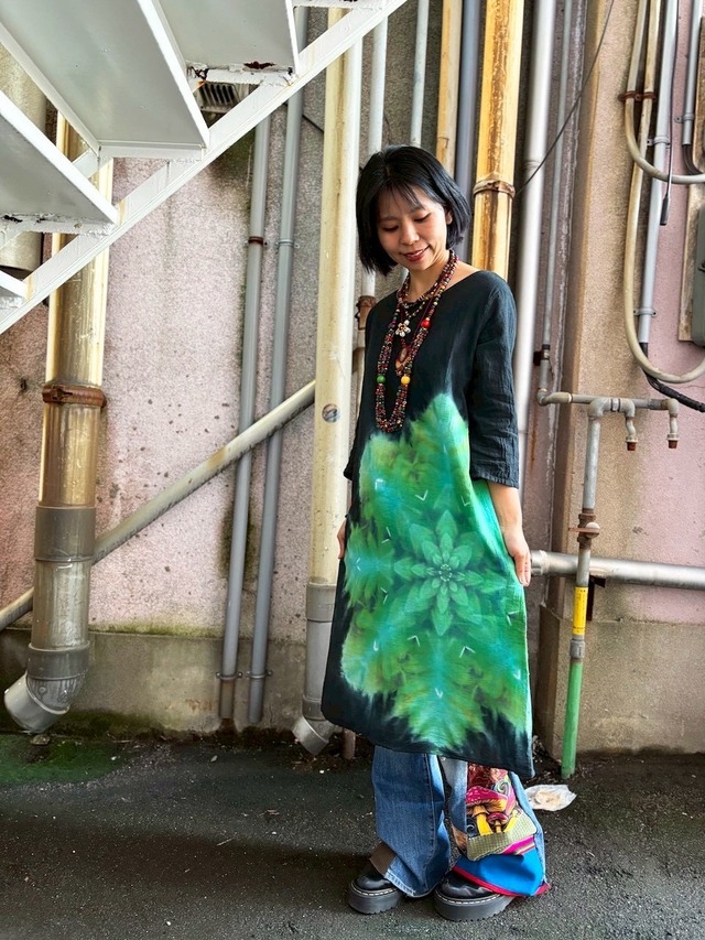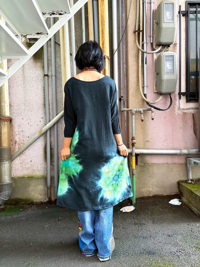 タイダイ Tie-dye 長袖ワンピース 黒 ブラックビューティ 碧翠色の幻想的なスノーフレイク HD25-15