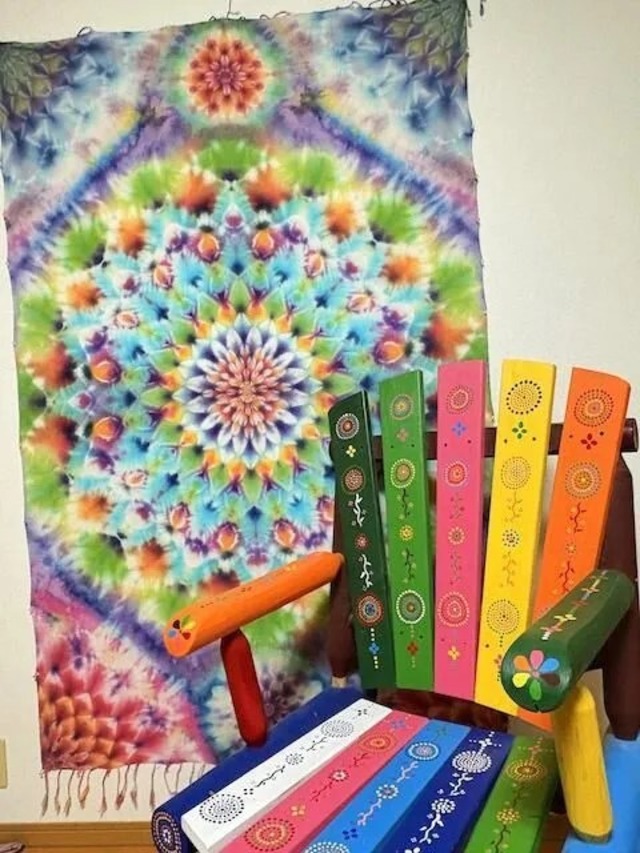 全て染色されるタイダイ染め、絞り染めの作品群。