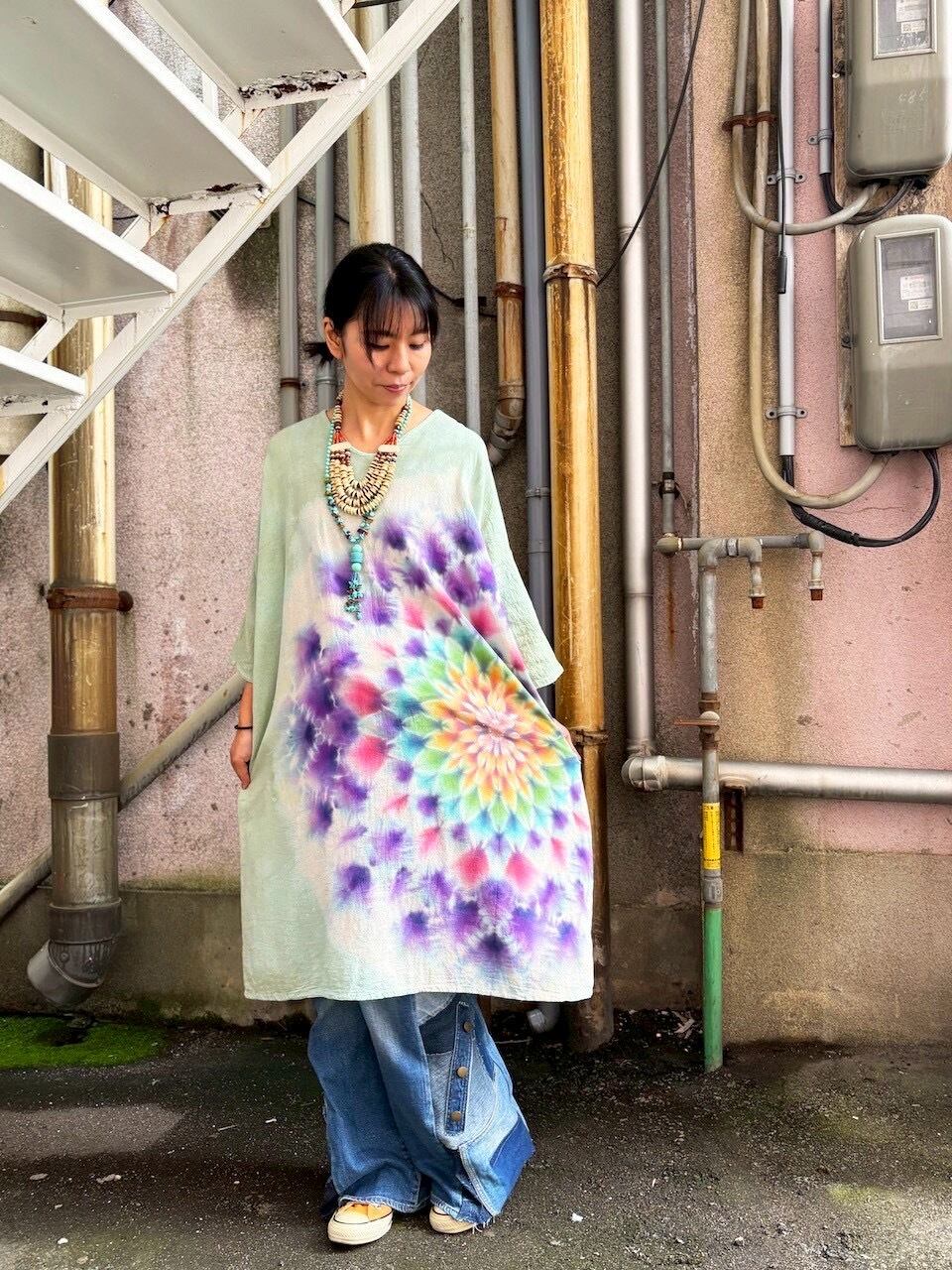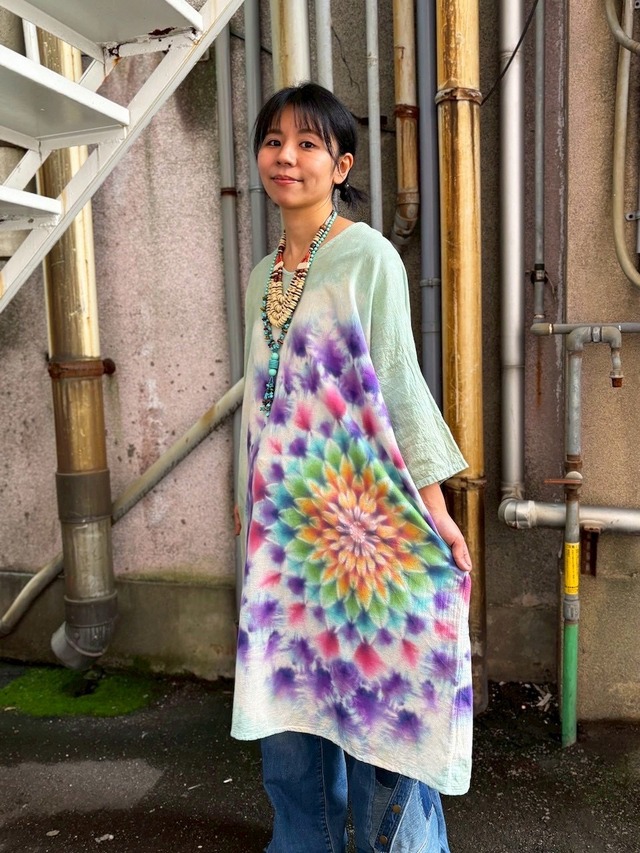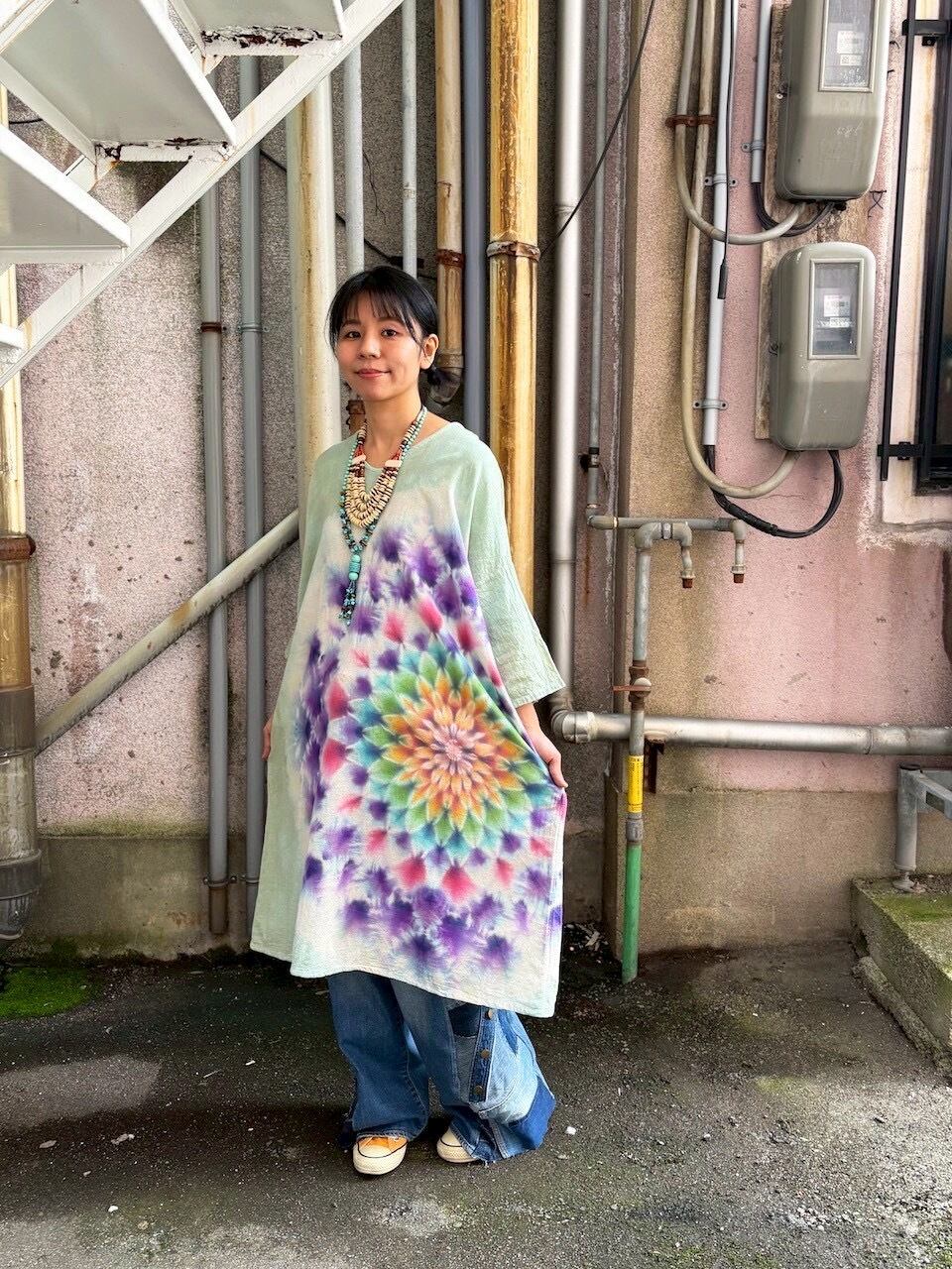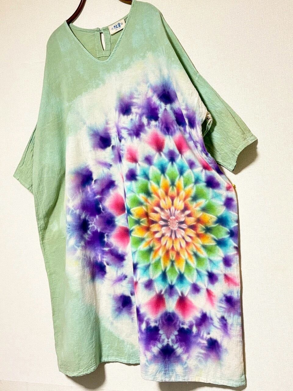 タイダイ Tie-dye ゆったりワンピース 千草色 美しい幻想的な大曼荼羅 Hippies Dye最新作 HD25-39