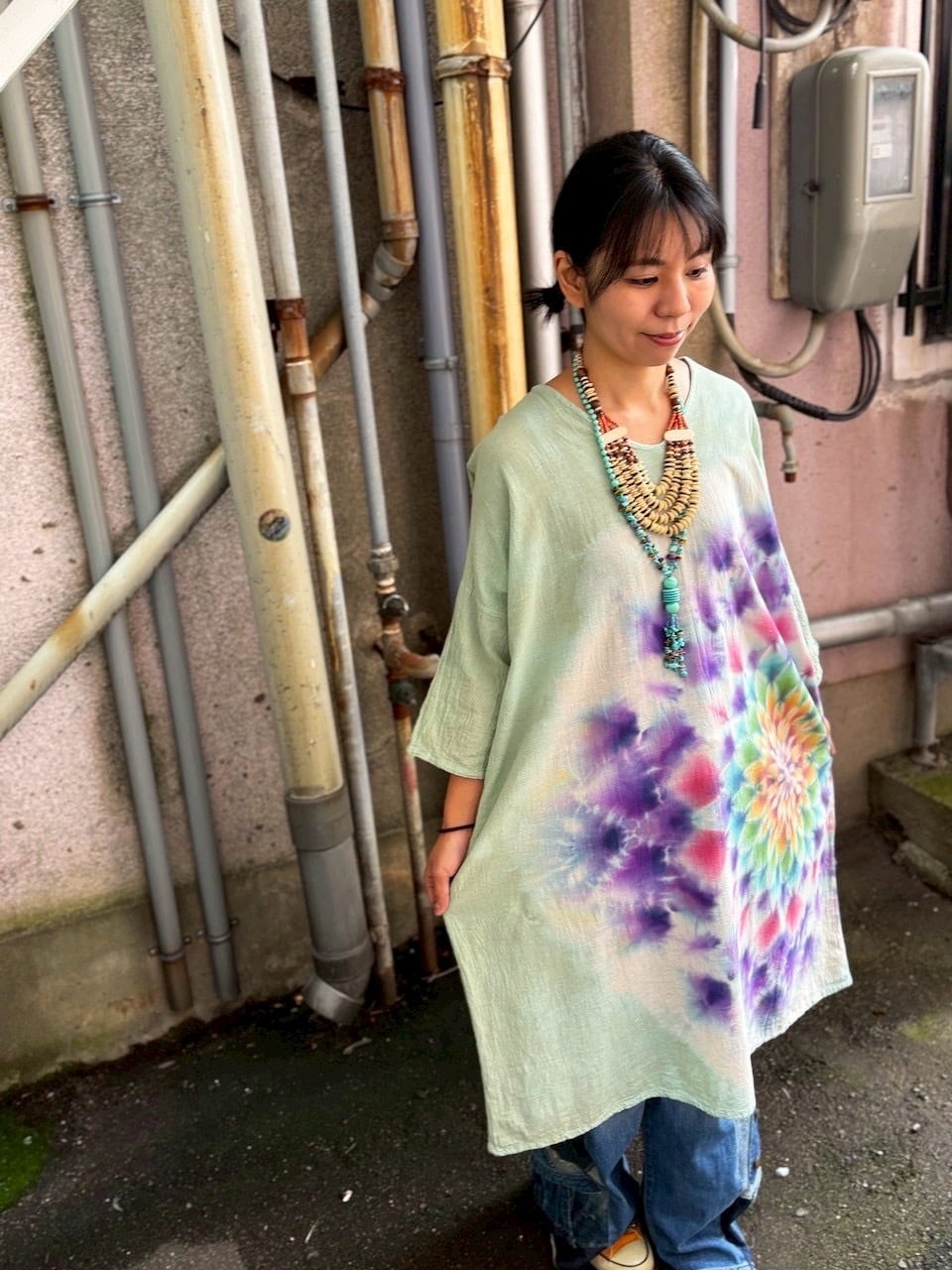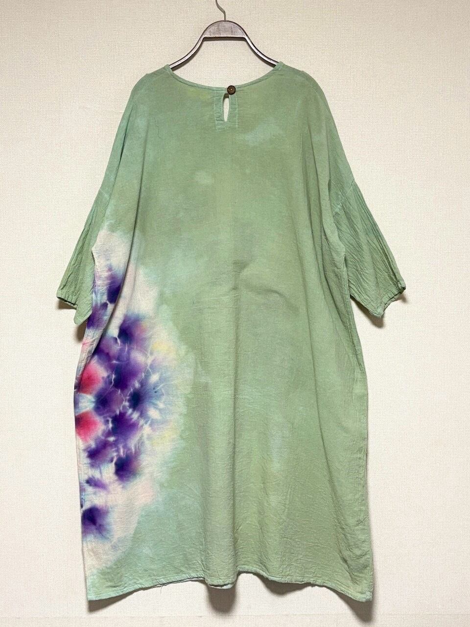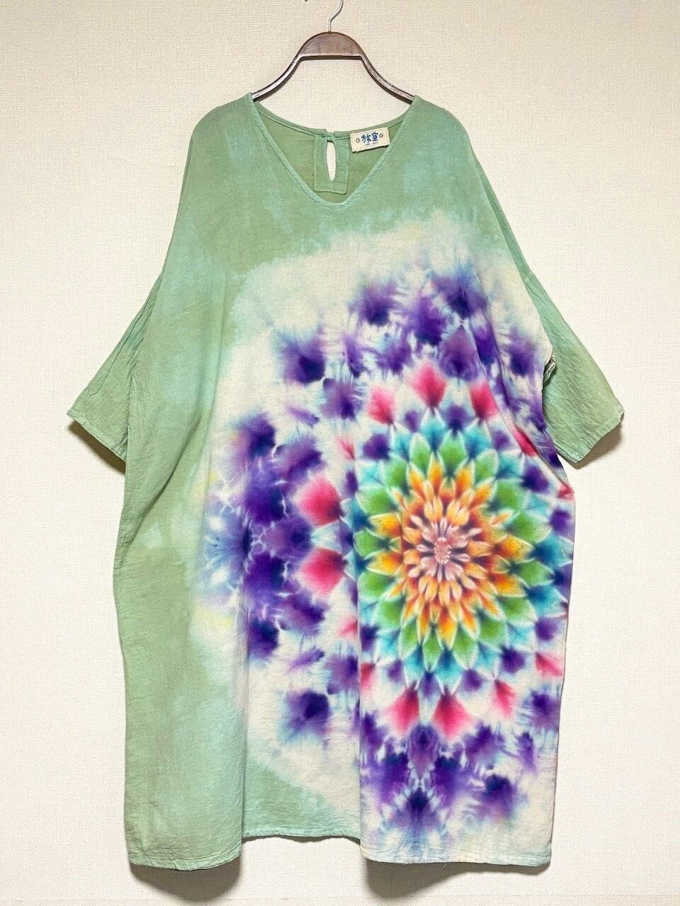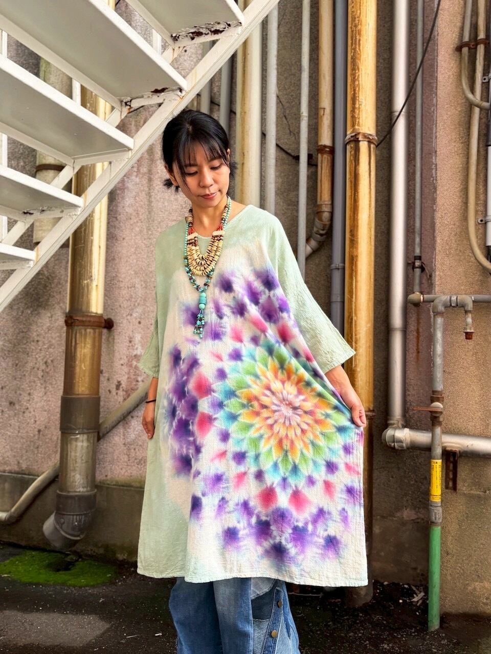 タイダイ Tie-dye ゆったりワンピース 千草色 美しい幻想的な大曼荼羅 Hippies Dye最新作 HD25-39