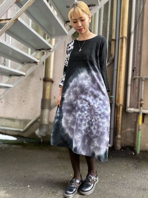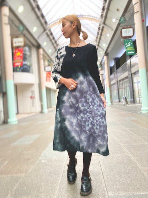 タイダイ染め Tie-dye 長袖ワンピース ブラックビューティ 美しい叢雲色の大曼荼羅 HD12-90