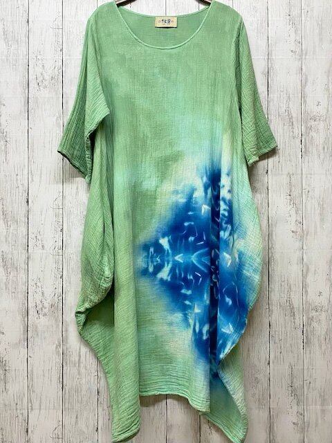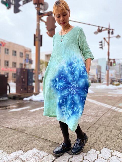 タイダイ染め Tie-dye ロングワンピース 優しい草木色×蒼いスノーフレイク ダブルガーゼ HD12-91