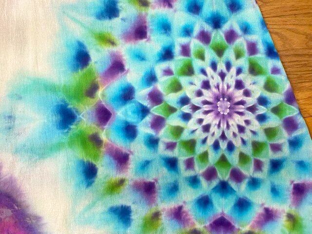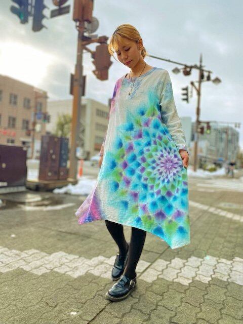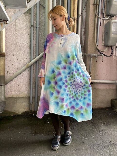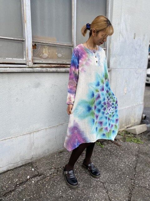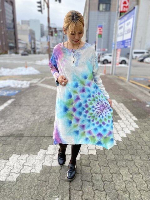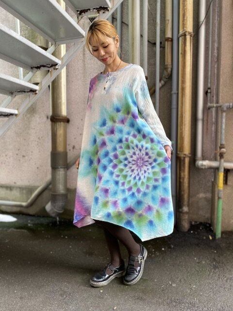 タイダイ染め Tie-dye ヘンリーネック 長袖ワンピース 艶やかな水面カラー×幻想的な大曼荼羅 HD12-93