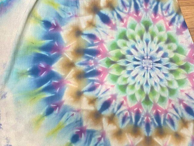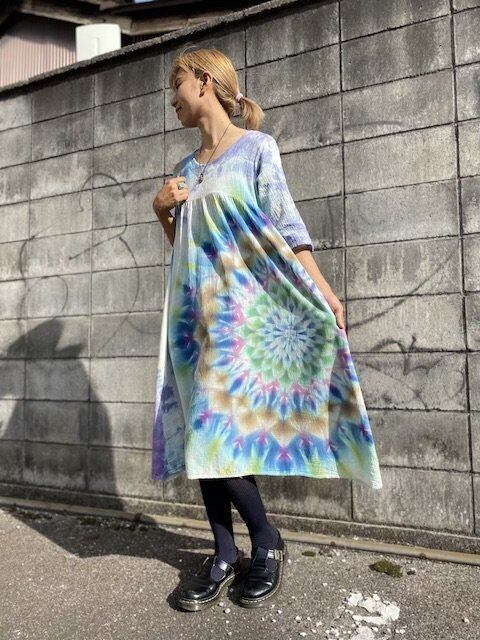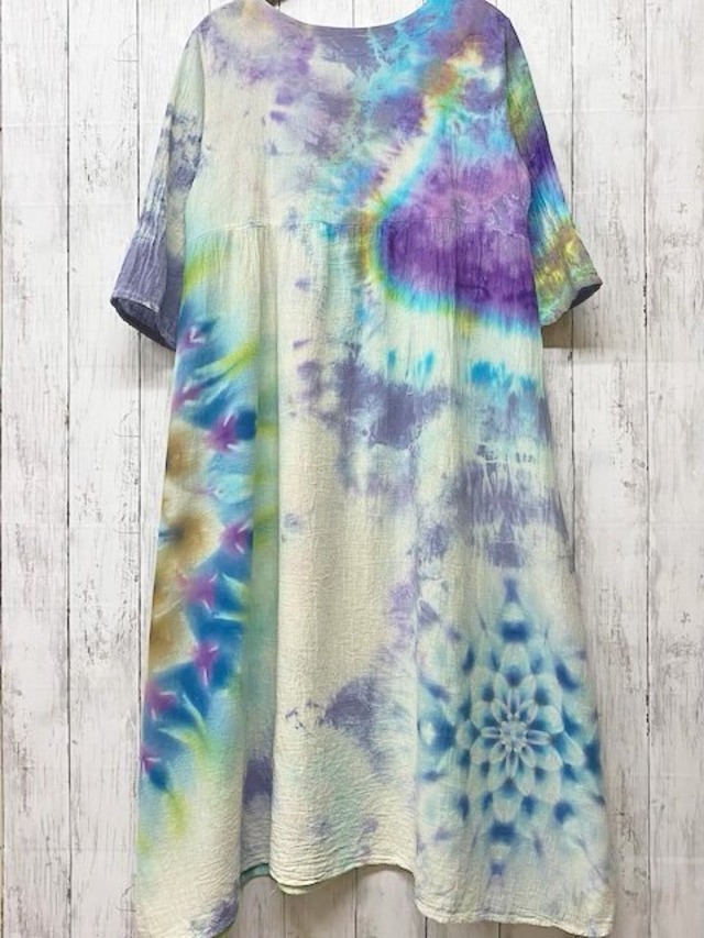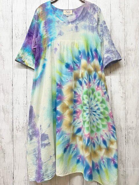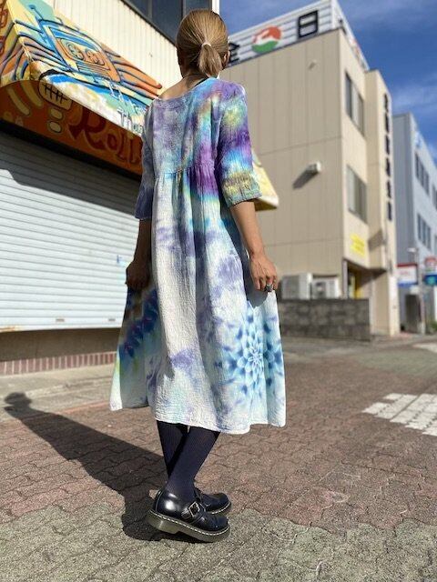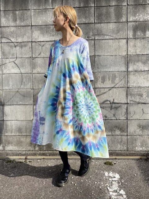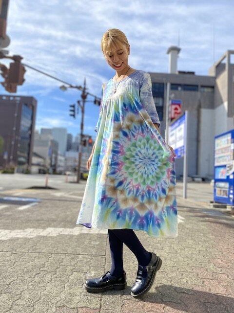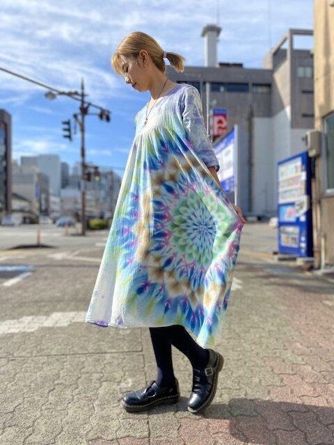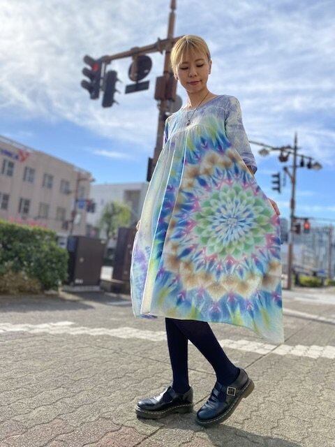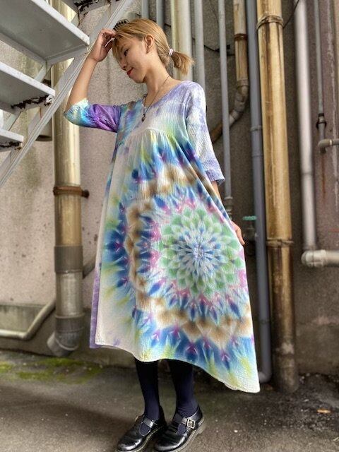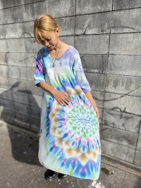 タイダイ染め Tie-dye ロングワンピース 美しい虹のかかる湖面カラー×艶やかな孔雀大曼荼羅 HD12-71