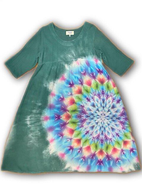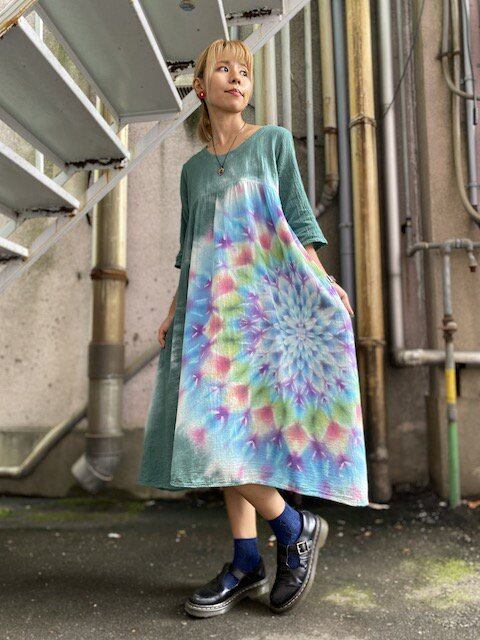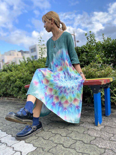 タイダイ染め Tie-dye ロングワンピース 碧緑色に艶やかな孔雀大曼荼羅 HD12-32