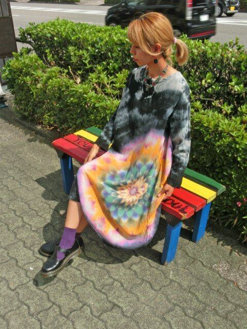 タイダイ染め Tie-dye ヘンリーネック 長袖ワンピース ブラックビューティ 幻想的な大曼荼羅 HD11-96