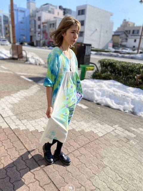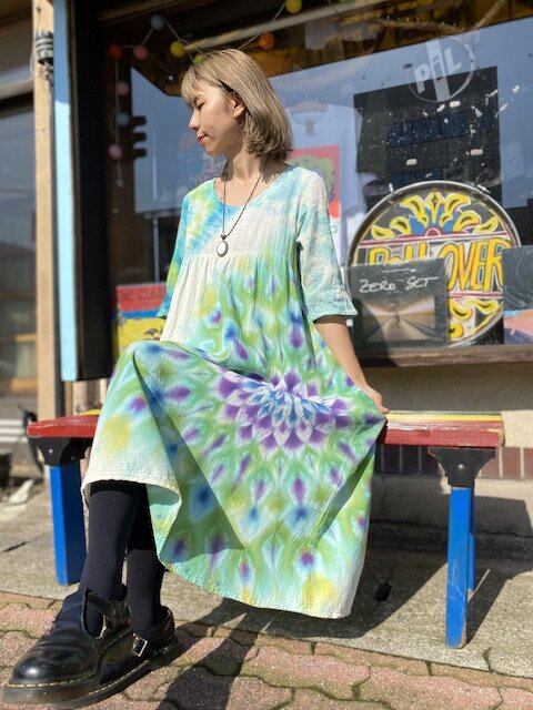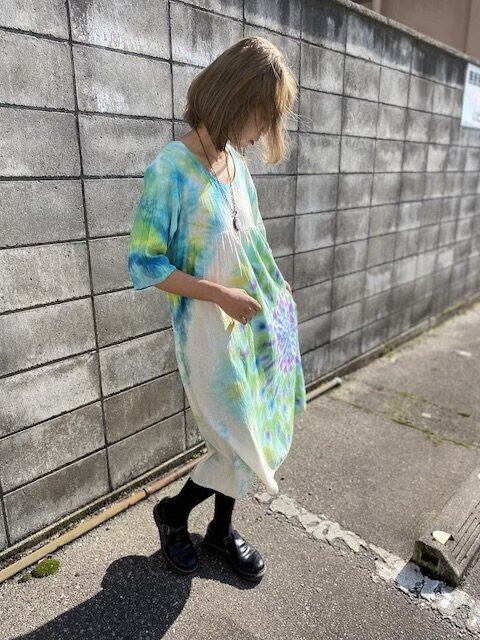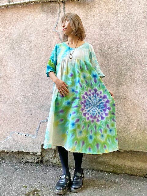 タイダイ染め Tie-dye ロングワンピース 空と水を映す湖面カラーに翡翠色の孔雀大曼荼羅 HD13-27