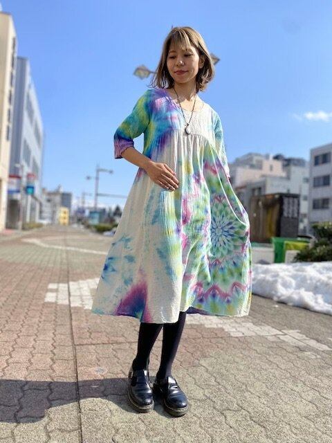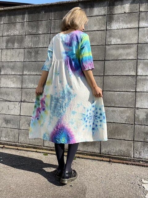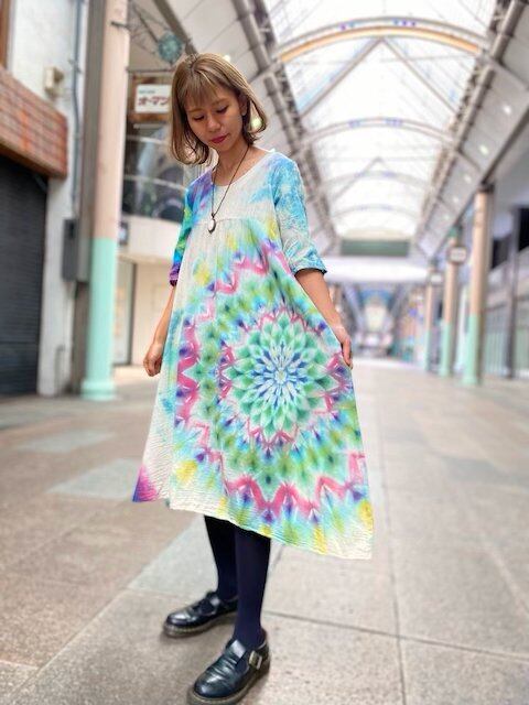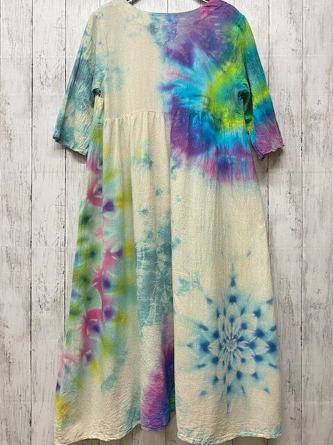 タイダイ染め Tie-dye ロングワンピース 淡く虹を映す湖面カラーに彩やかに羽を広げる孔雀大曼荼羅 HD13-28
