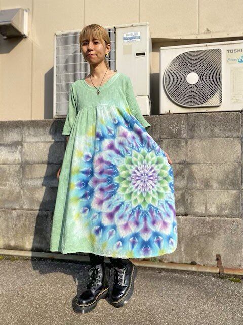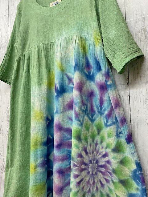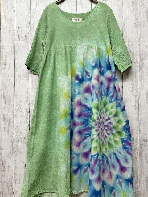 タイダイ染め Tie-dye ロングワンピース 優しい草木染め系グリーンに彩やかに羽を広げる孔雀大曼荼羅 HD13-45