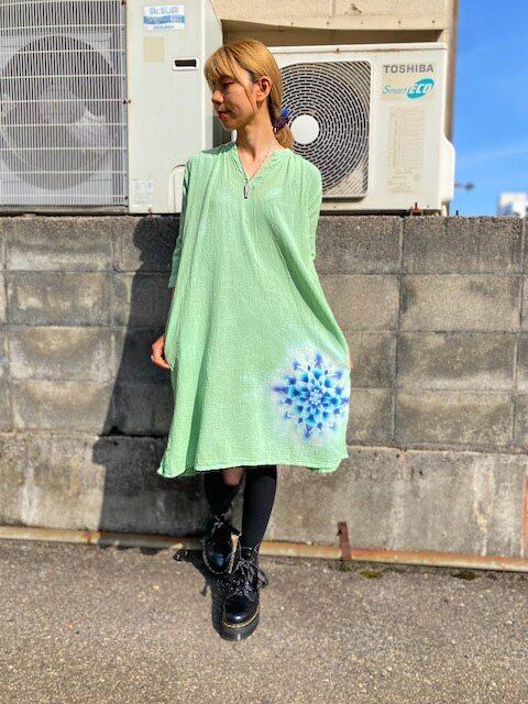 タイダイ染め Tie-dye 七分袖 チュニック 優しいグリーンに幻想的な曼荼羅模様 HD13-55