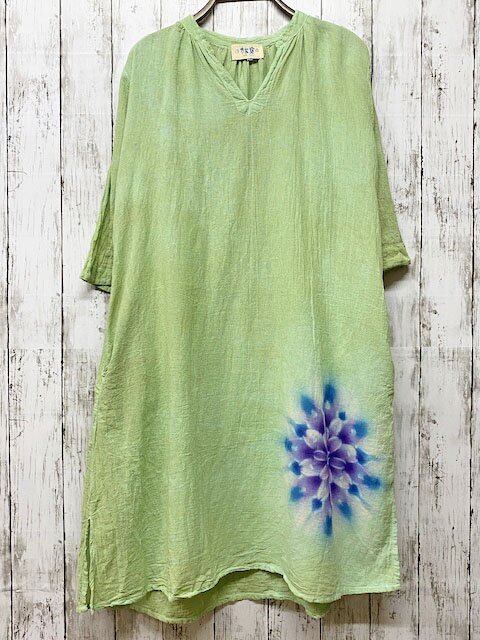 タイダイ染め Tie-dye 七分袖 チュニック 優しいグリーンに幻想的な曼荼羅模様 HD13-83