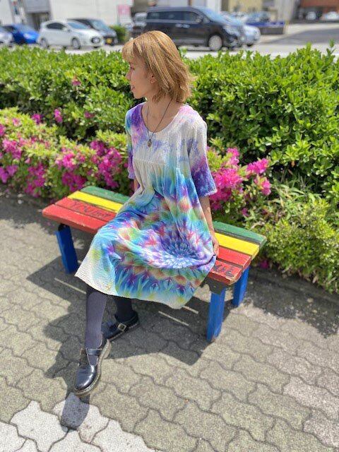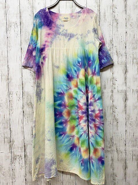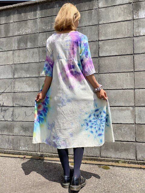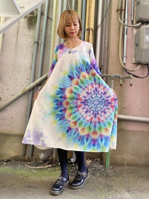 タイダイ染め Tie-dye ロングワンピース 空や光、虹と水を映す湖面カラーに彩やかに羽を広げる孔雀大曼荼羅 HD13-85