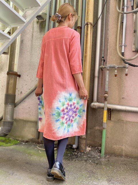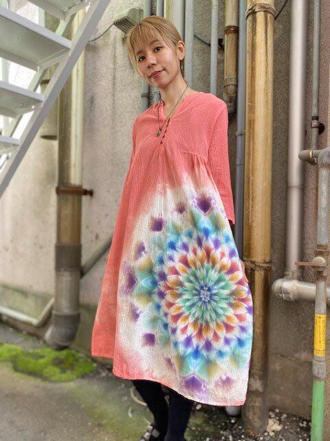 タイダイ染め Tie-dye チュニック ワンピース 優しい紅色に幻想的な大曼荼羅模様 HD13-86