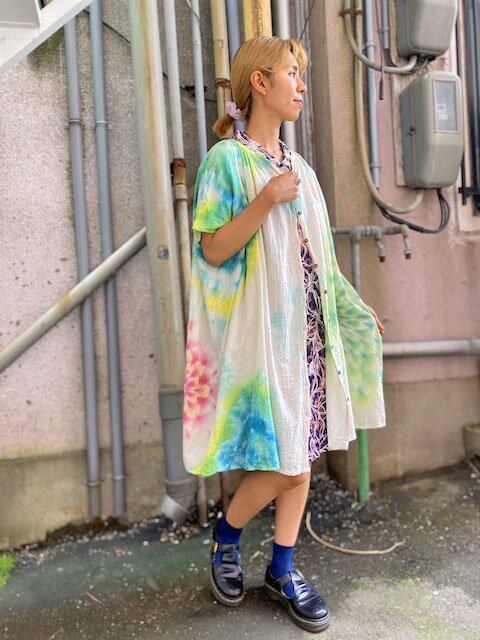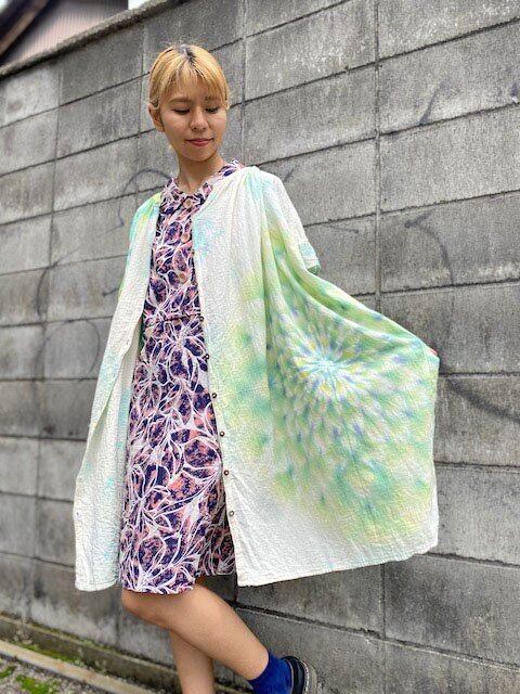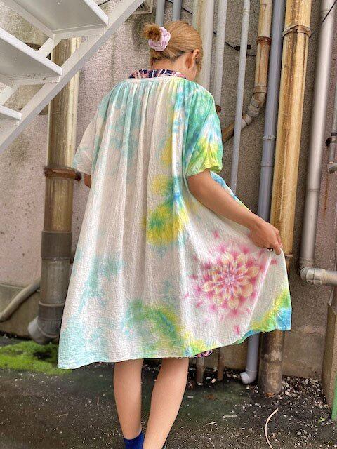 タイダイ染め Tie-dye 半袖ワンピース ゆったり前開き 生命溢れる碧色の湖面に翡翠色の大曼荼羅 HD13-95