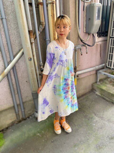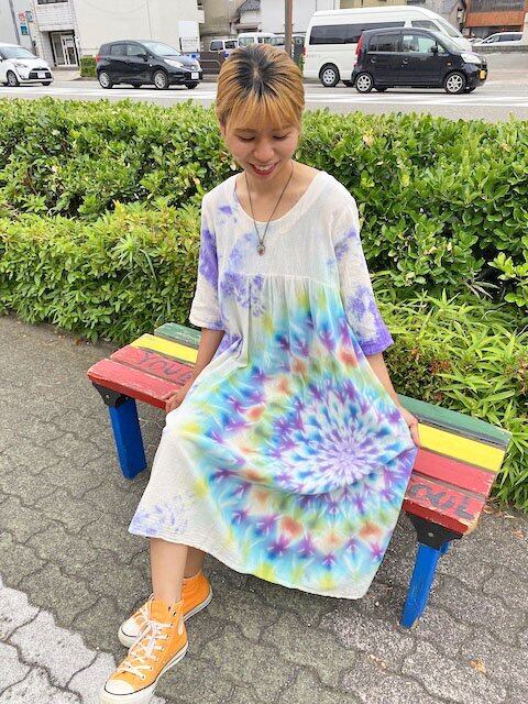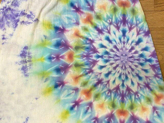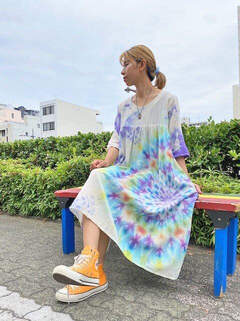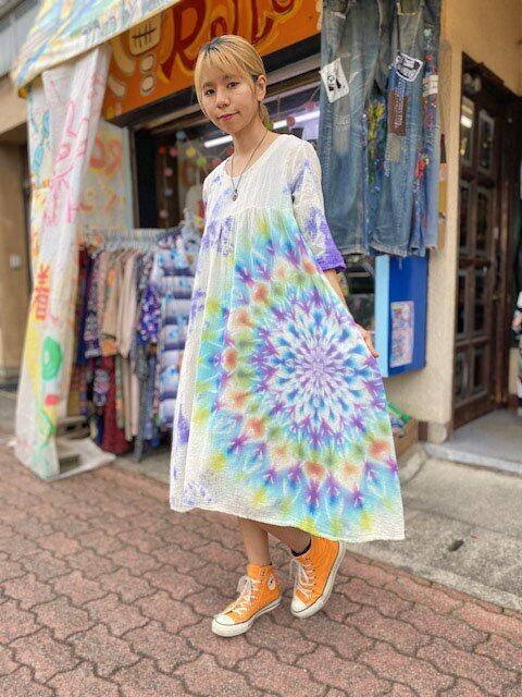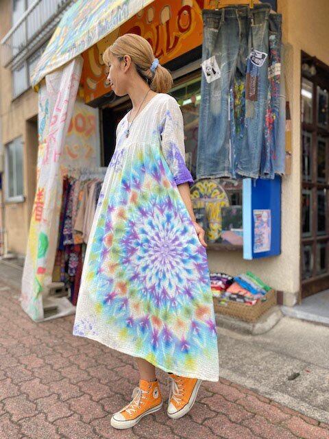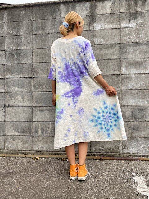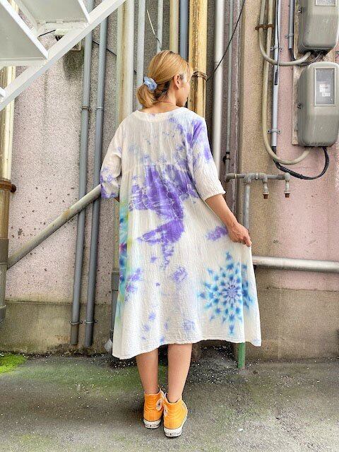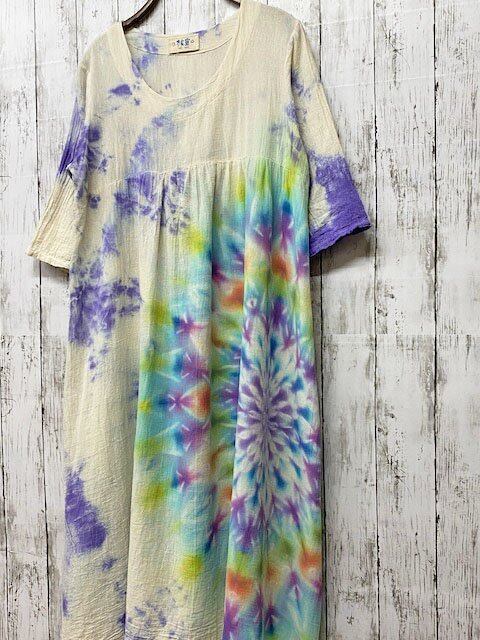 タイダイ染め Tie-dye ロングワンピース パープルブルーのムラ染めに幻想的な孔雀大曼荼羅 HD14-21