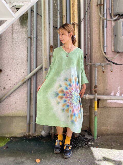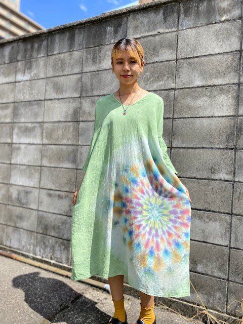 タイダイ染め Tie-dye ゆったりワンピース 若葉色に美しい曼荼羅模様 HD14-89