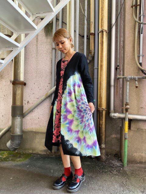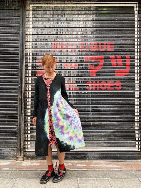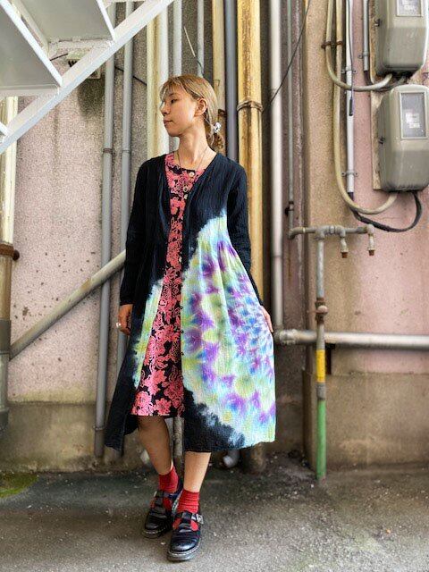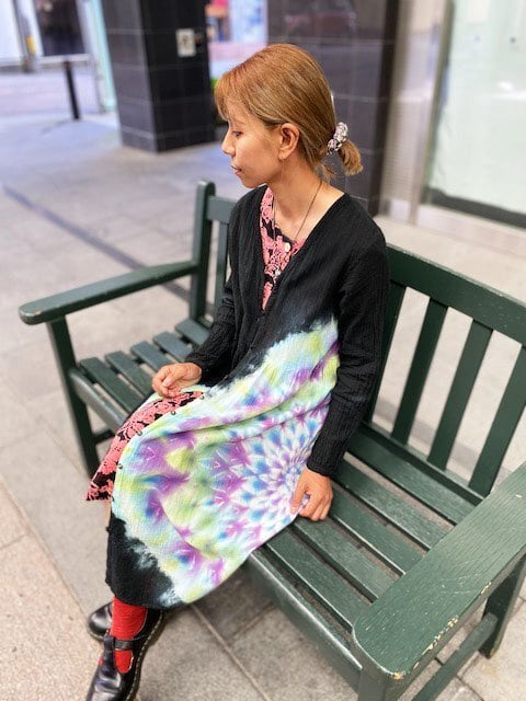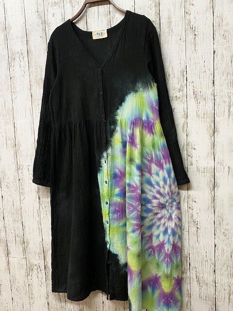 タイダイ染め Tie-dye 前開きワンピース ゆったりデザイン ブラックビューティ 美しい幻想的な孔雀大曼荼羅 HD15-09