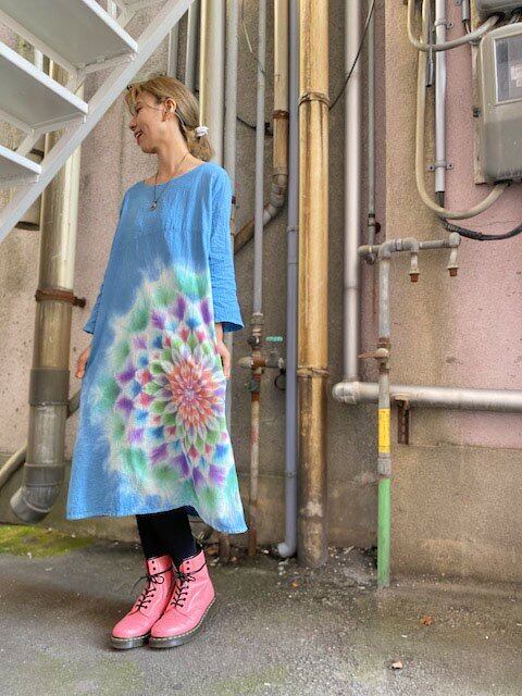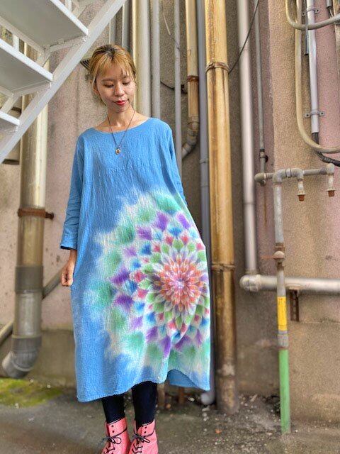 タイダイ染め Tie-dye 新型長袖ワンピース ティールブルー 美しく華やかな大曼荼羅 HD15-18