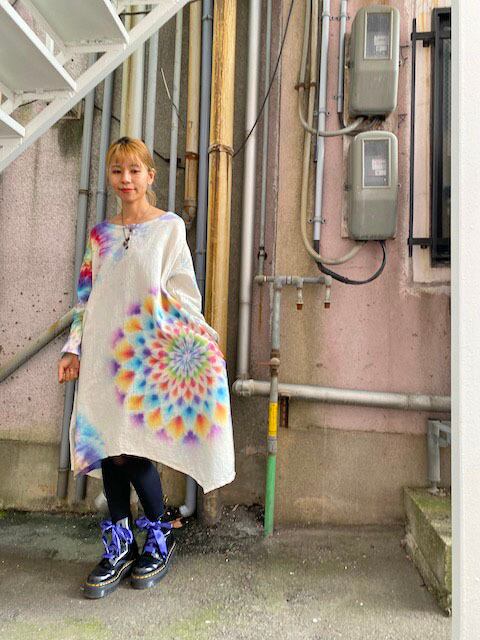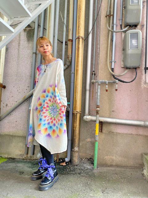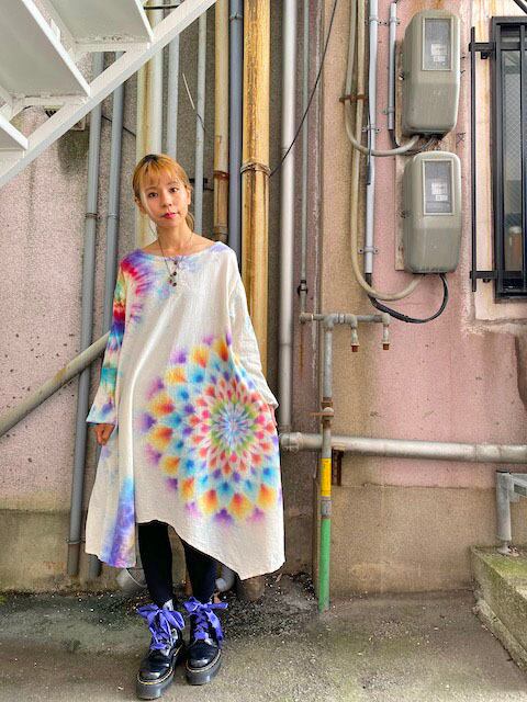 タイダイ染め Tie-dye ヘンリーネック 長袖 ワンピース 華やかな色合いの幻想的な大曼荼羅☆ HD15-21
