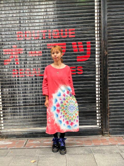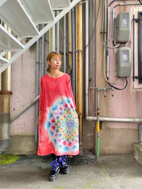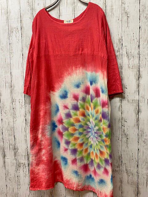 タイダイ染め Tie-dye 新型長袖ワンピース 紅色に美しい曼荼羅模様 Hippies Dye最新作 HD15-23