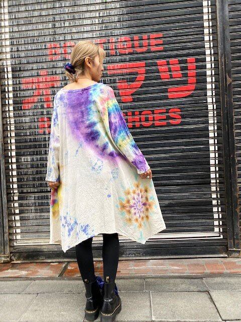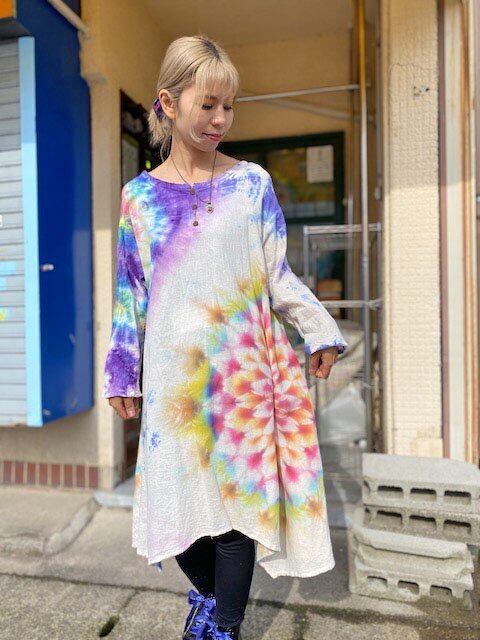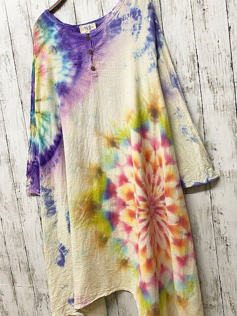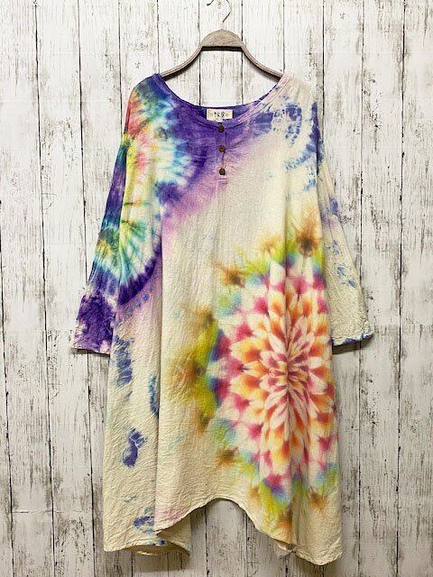 タイダイ染め Tie-dye ヘンリーネック 長袖 ワンピース 華やかな色合いの幻想的な大曼荼羅☆ HD15-69
