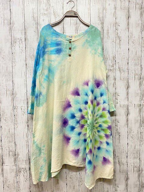 タイダイ染め Tie-dye ヘンリーネック 長袖 ワンピース 空色に碧翠色の幻想的な大曼荼羅 HD16-04