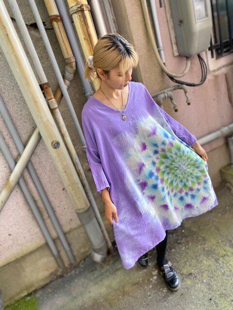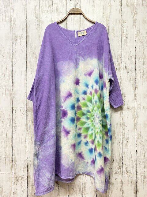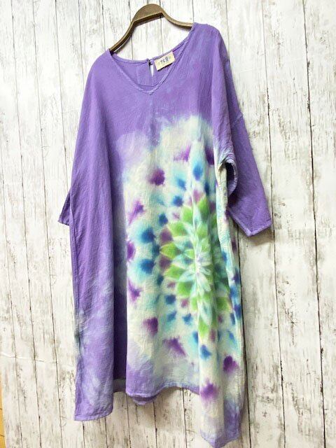 タイダイ染め Tie-dye ゆったりワンピース 優しいラベンダーに碧翠色の大曼荼羅 Hippies Dye最新作 HD16-14