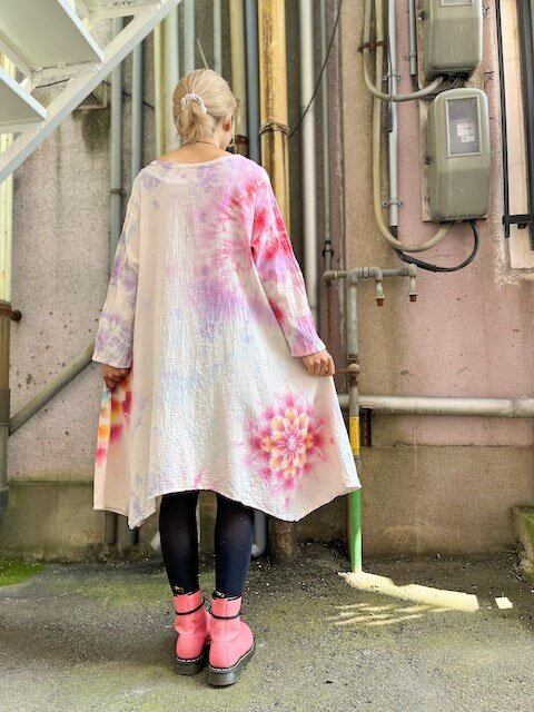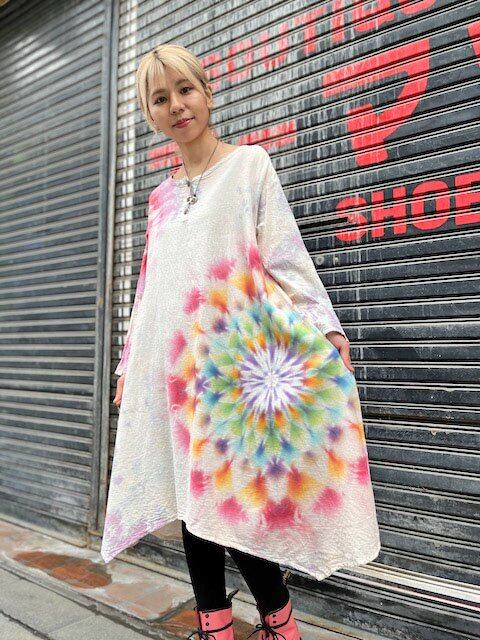 タイダイ染め Tie-dye ヘンリーネック 長袖 ワンピース 桜と空と風のイメージに華のように幻想的な大曼荼羅 HD16-30