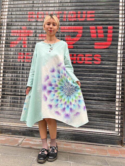 タイダイ染め Tie-dye ヘンリーネック 長袖 ワンピース 優しい風のようなミントグリーンに幻想的な碧碧色の大曼荼羅 HD16-46