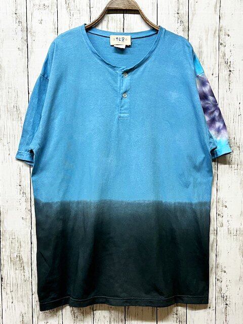 ヘンリーネックTシャツに、下地に優しく淡いブルーを染めて、