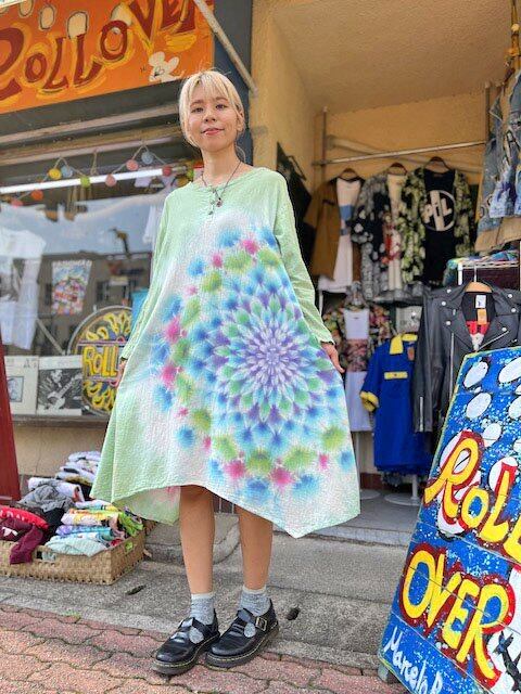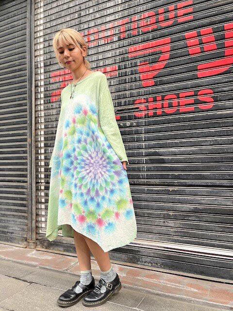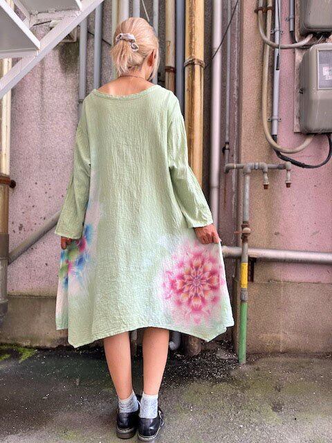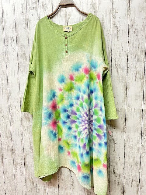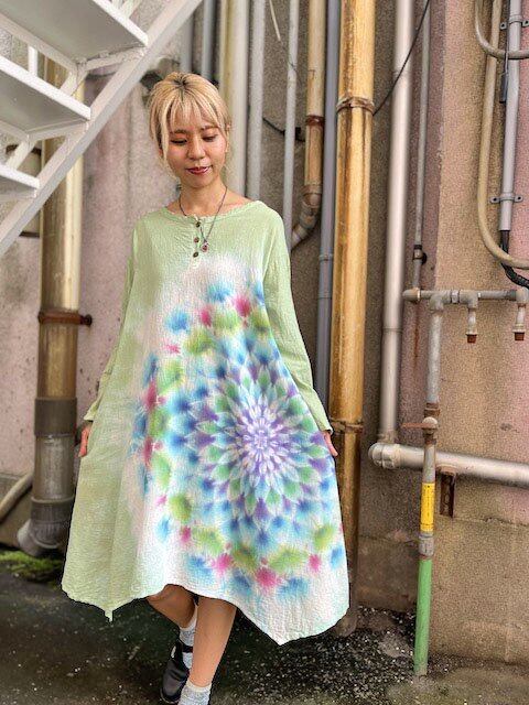 タイダイ染め Tie-dye ヘンリーネック 長袖 ワンピース 優しい風のようなグリーンに幻想的な碧翠色の大曼荼羅 HD16-79