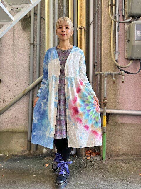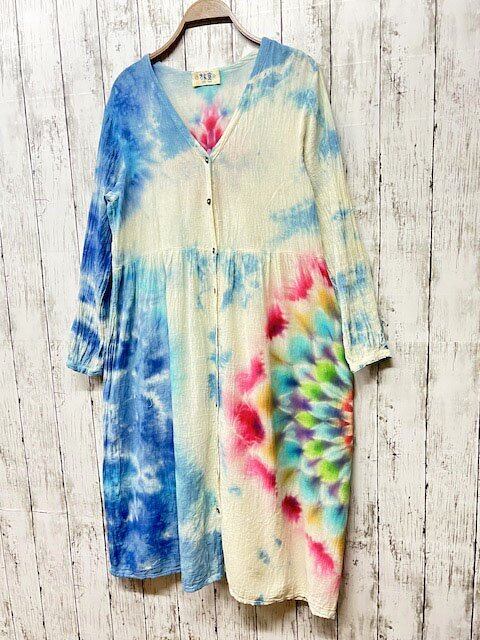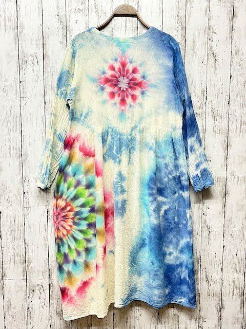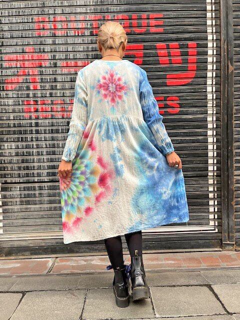 タイダイ染め Tie-dye 前開きのロングワンピース 美しい藍色のムラ染めに幻想的で華やかな大曼荼羅 HD17-64