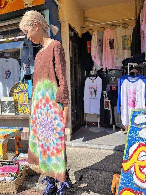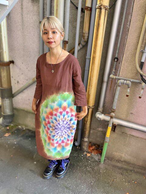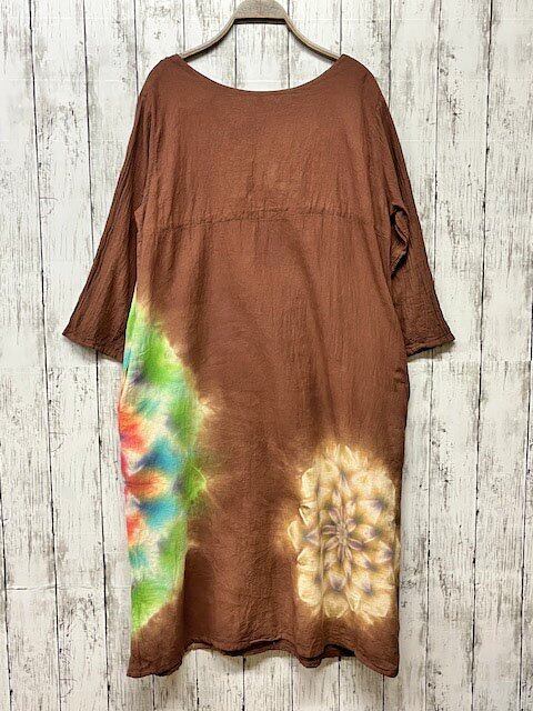 タイダイ染め Tie-dye 長袖ワンピース 優しいブラウンカラーに美しい曼荼羅模様 HD17-65