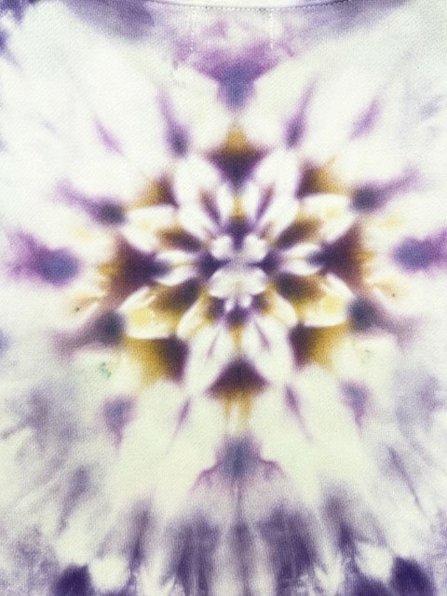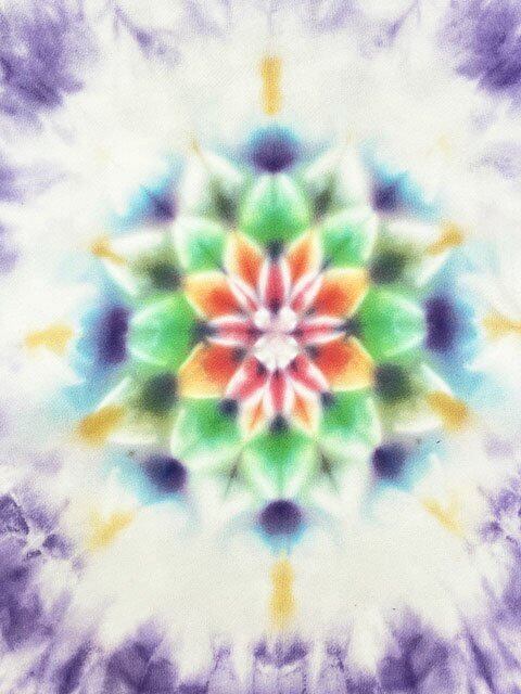手染めならではの爽やかな色合いのタイダイ染めに、美しい花のような曼荼羅模様を染め上げました。