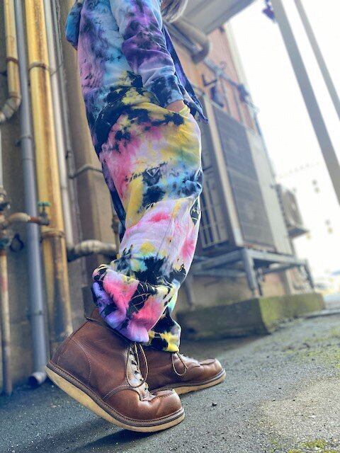 トレンドのスウェットパンツを、当店タイダイ染めアーティストが染め上げた一点物。