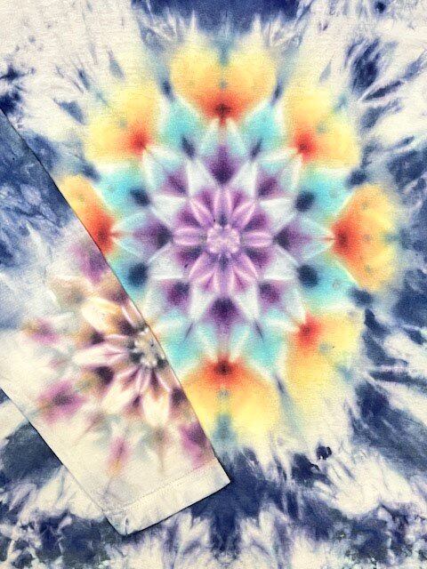 染めならではの奥深さを表現したブルーのムラ染めを主体に虹を彩る微細な色彩を曼荼羅の花に咲かせました。