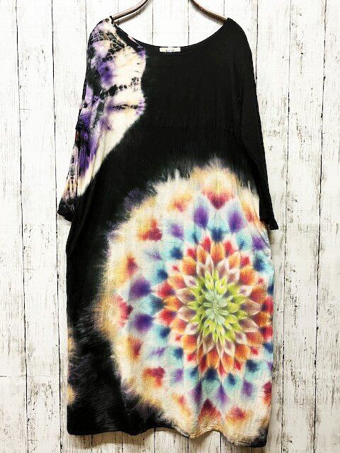 タイダイ染め Tie-dye 長袖ワンピース ブラックビューティ 美しい曼荼羅模様 HD18-68