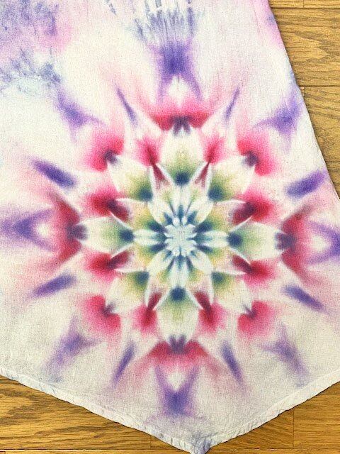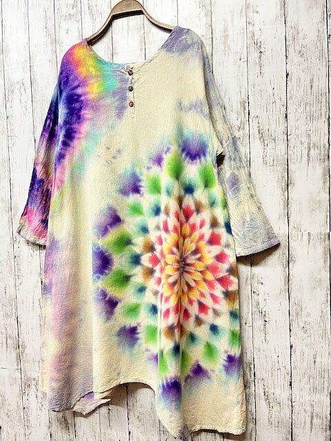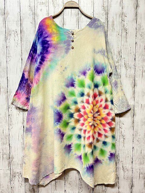 タイダイ染め Tie-dye 新型ヘンリーネック長袖ワンピース 虹を映す湖面に咲く、優しく雄々しい華のような幻想的な大曼荼羅 HD18-95