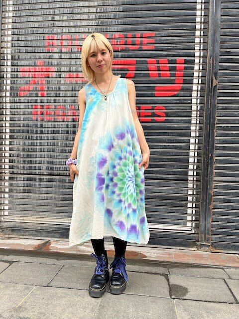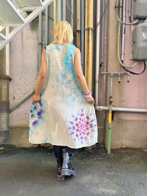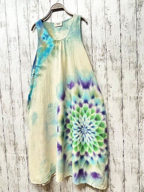 タイダイ染め 新型ノースリーブワンピース 爽やかな水面カラーに美しい碧翠色の幻想的な大曼荼羅 HD19-30