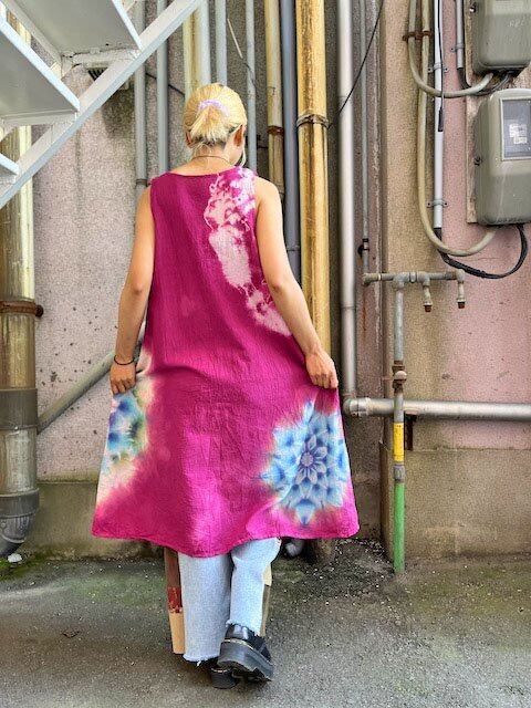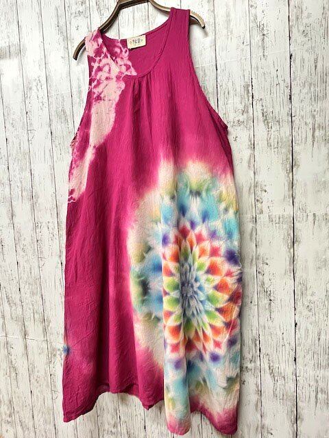 タイダイ染め 新型ノースリーブワンピース 人気のワインレッドに幻想的な大曼荼羅 HD19-33