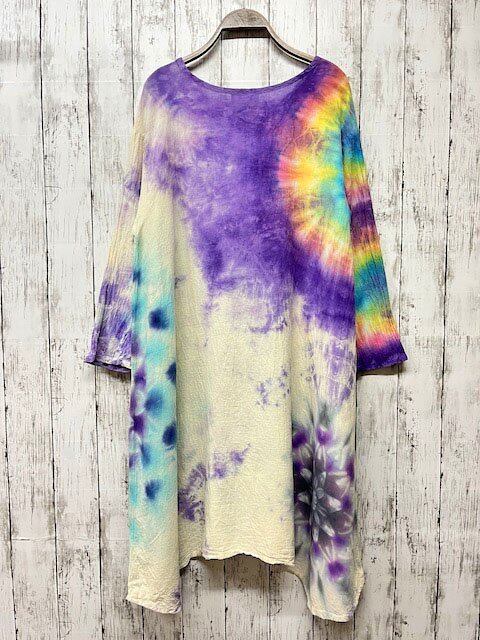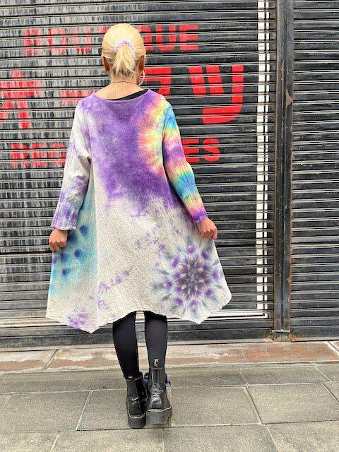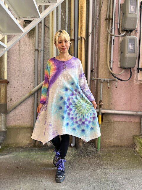 タイダイ染め Tie-dye 新型ヘンリーネック長袖ワンピース 虹とラベンダーを映す湖面に波紋のうな優しく幻想的な大曼荼羅 HD19-34