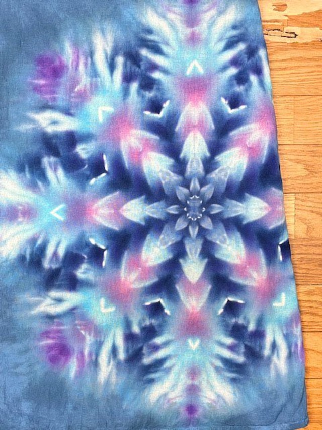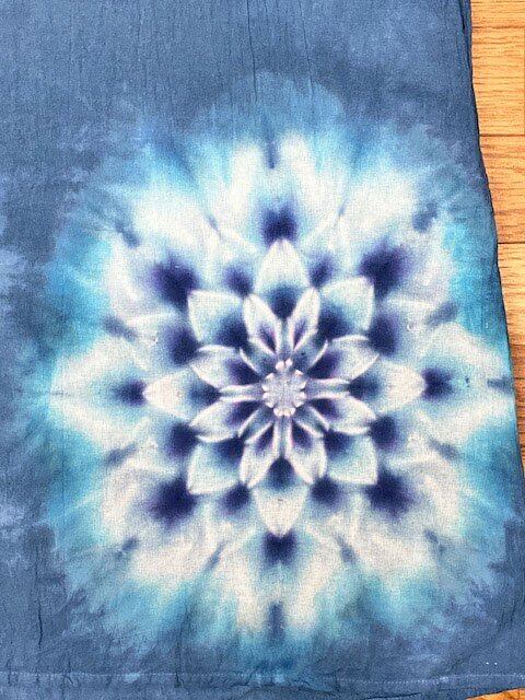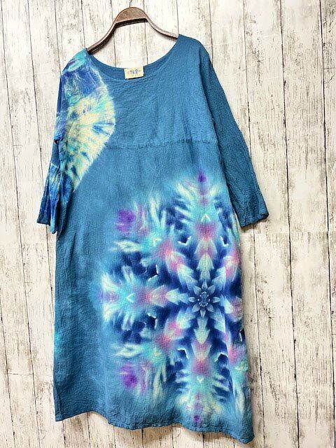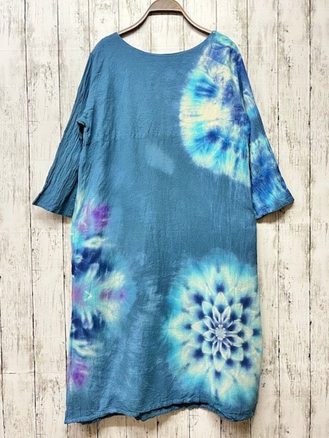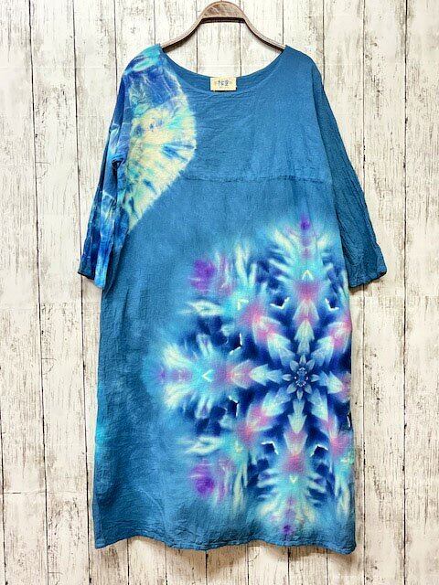 タイダイ染め Tie-dye 長袖ワンピース ティールブルー 藍色に華を咲かせる大輪のスノーフレイク HD19-68