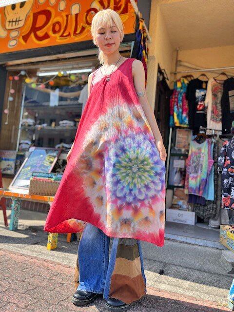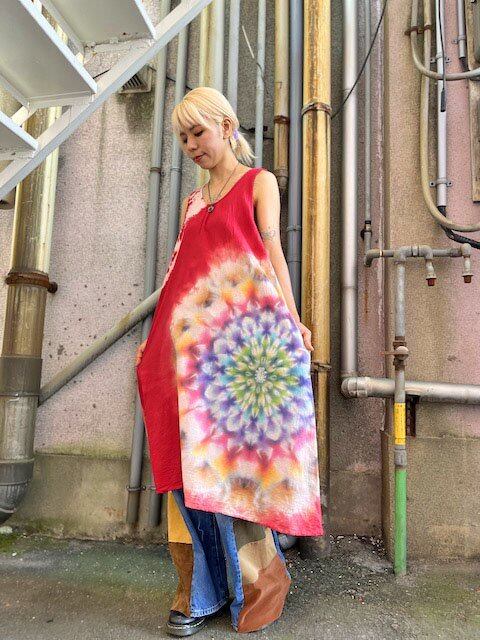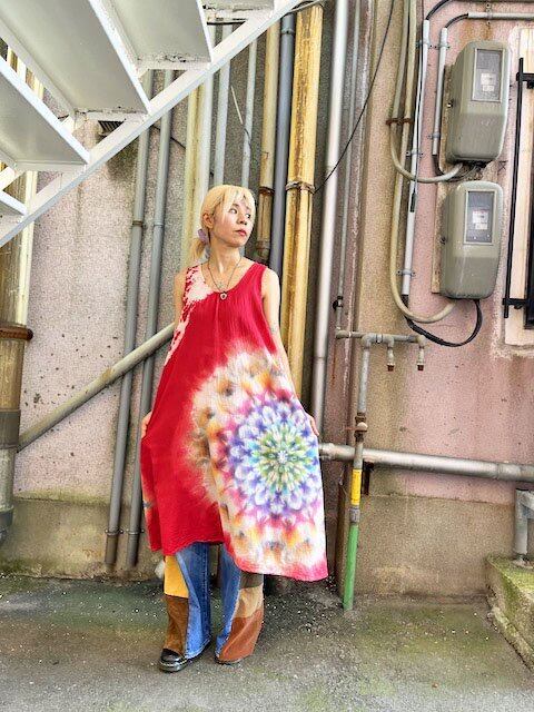 タイダイ染め 新型ノースリーブワンピース 大人気のレッドに幻想的な大曼荼羅 HD19-94