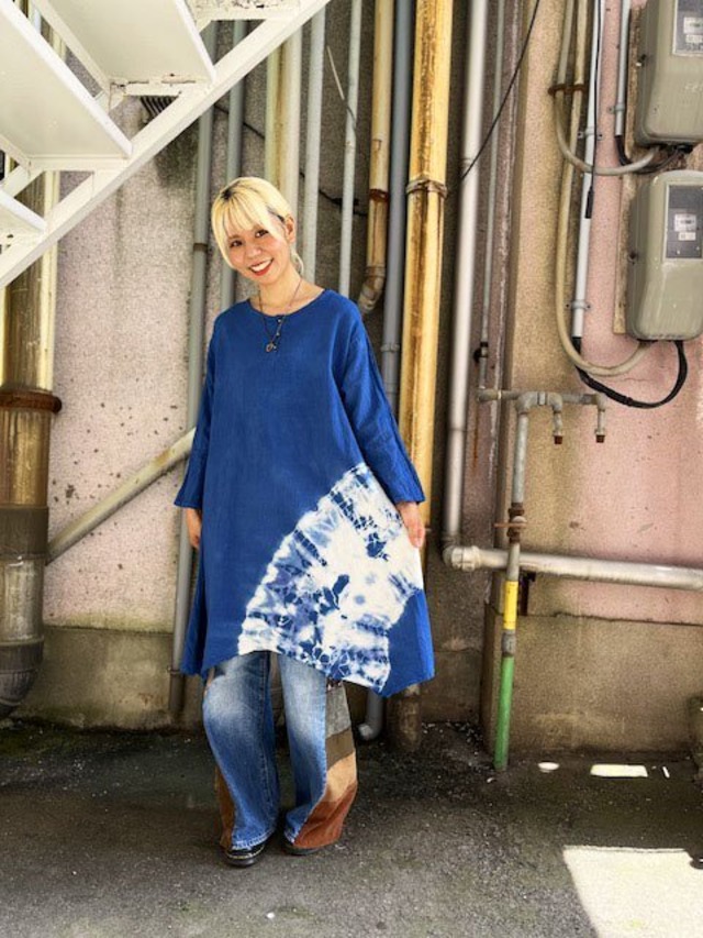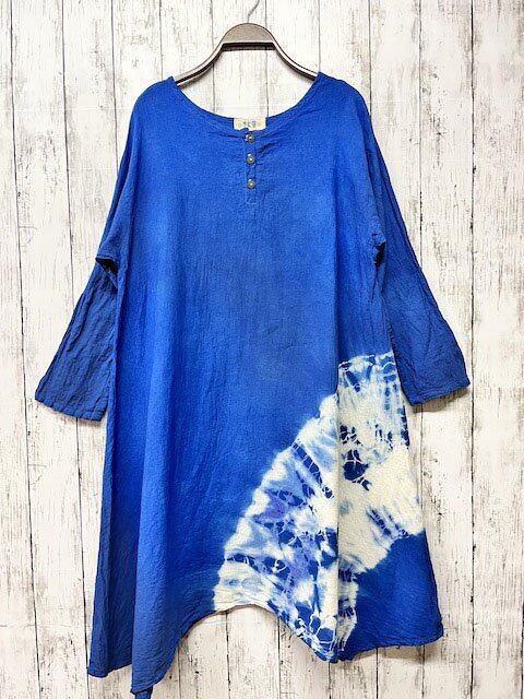 タイダイ染め Tie-dye 新型ヘンリーネック長袖ワンピース 藍色の絞り染め HD20-16
