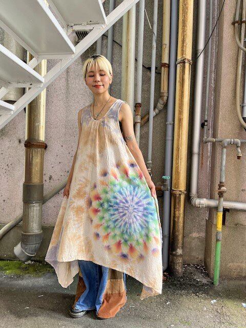 タイダイ染め 新型ノースリーブワンピース ベージュ×グレーのムラ染めに幻想的な大曼荼羅 HD20-26