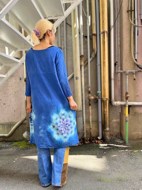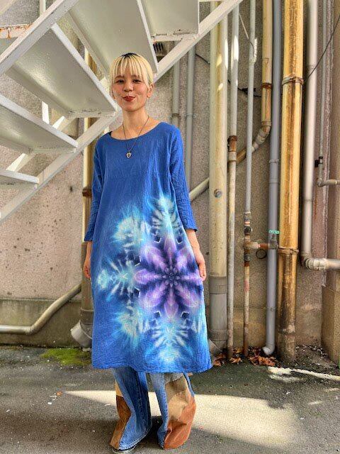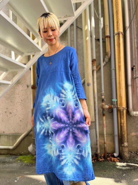 タイダイ染め Tie-dye 長袖ワンピース 藍色と紫の美しいコントラストのスノーフレイク HD20-30